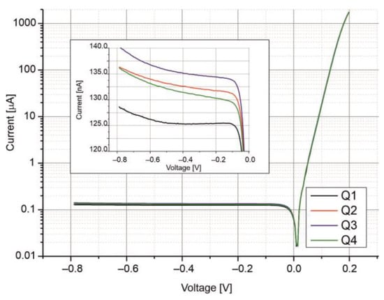 Current–voltage characteristics of the four-channel photodiode measured at T = 210 K. Q1, Q2, Q3, and Q4 represent the individual segments of the photodiode.