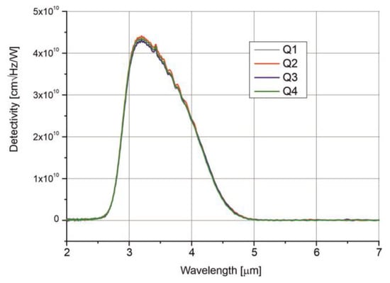 Figure 8 presents the detectivity (D*) spectra of the four-segment photodiode, measured at a temperature of 210 K. The spectra are uniform, with a 10% cut-on at 2.7 μm and a 10% cut-off at 4.6 μm, reaching a peak detectivity at 3.2 μm.