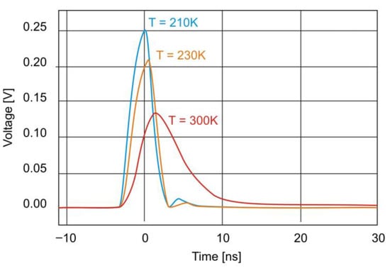 Figure 9 shows the photodiode’s time response to 5 μm laser excitation at zero bias at three different temperatures. As the temperature decreases, the photodiode’s bandwidth increases (rise time decreases), reaching 50 MHz at T = 300 K, 200 MHz at T = 230 K, and 260 MHz at T = 210 K.