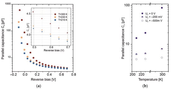 (a) Capacitance–voltage characteristics at various temperatures; (b) parallel capacitance as a function of temperature for three reverse bias voltages.
