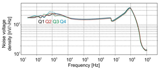 Frequency dependence of the noise voltage density for the four channels of the QM-4 detection module.