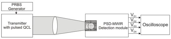The functionality of the QD-MWIR detection module as a beam tracking device was verified in a laboratory setup, as shown in Figure 12. The transmitter utilizes a pulsed quantum cascade laser (model QCL834) developed at the Institute of Microelectronics and Photonics (Łukasiewicz Research Network). The laser is housed in a hermetically sealed HHL casing, which also contains a TEC module and a temperature sensor. Radiation is emitted through an optical window and has a divergence of 350 (full-width at half maximum). The system generates radiation pulses at a wavelength of approximately 3.9 µm, with a peak power of up to 600 mW and a duty cycle of less than 5%. The operating point of the laser is controlled by adjusting the current and temperature using the LDP-V 03-100 V4 from Picolas and the TEC WTC32ND 2.2 A from Wavelength Electronics, respectively. The light signals are triggered by the PICOSECOND model 12,000 generator, which, during the initial phase of the research, was operated in pulse mode with adjustable duration and frequency.