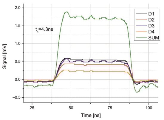 The pulse from each QD’s channel was recorded to determine the signal bandwidth. The rise time ranged from 4.1 ns to 4.4 ns. Figure 13 shows the pulse shapes of each channel as well as their combined signal. Considering the laser pulses’ rise time of 3 ns, the approximate bandwidth of the QD-MWIR module is estimated to be around 110 MHz.