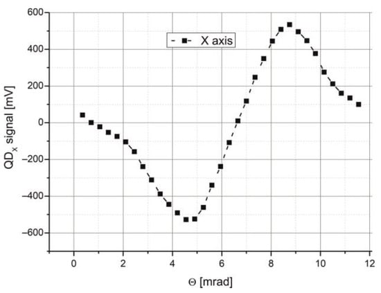 The transfer characteristic of the QD-MWIR module during beam tracking was also measured. In this phase of the research, the Picosecond generator again operated in pulse mode. A collimated QCL laser beam was focused onto the detector surface using a Ge lens (25 × 40, Edmund Optics). The optical path length was 1 m. Angular adjustments of the beam position were made using a Standa rotary stage (model 8MR-151). Output signals from the QD-MWIR module were recorded with a four-channel Tektronix oscilloscope (MSO 6), which also calculated their sum. The axial position difference signal was automatically computed by inputting formula [2] into the oscilloscope math function editor. The resulting transfer characteristic is shown in Figure 14.