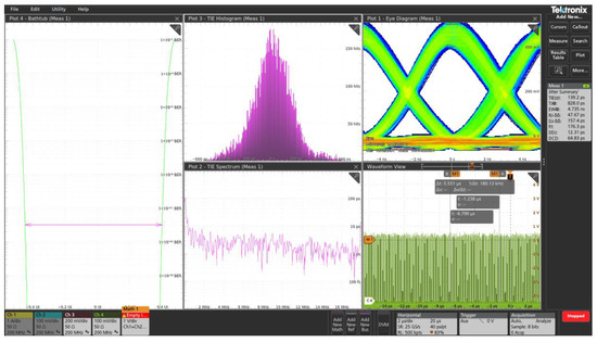 Figure 16 shows a screenshot of the oscilloscope with the measurement results. The data indicate a minimum time slot for RZ (return-to-zero) encoding of approximately 6 ns, and a jitter of less than ±600 ps.