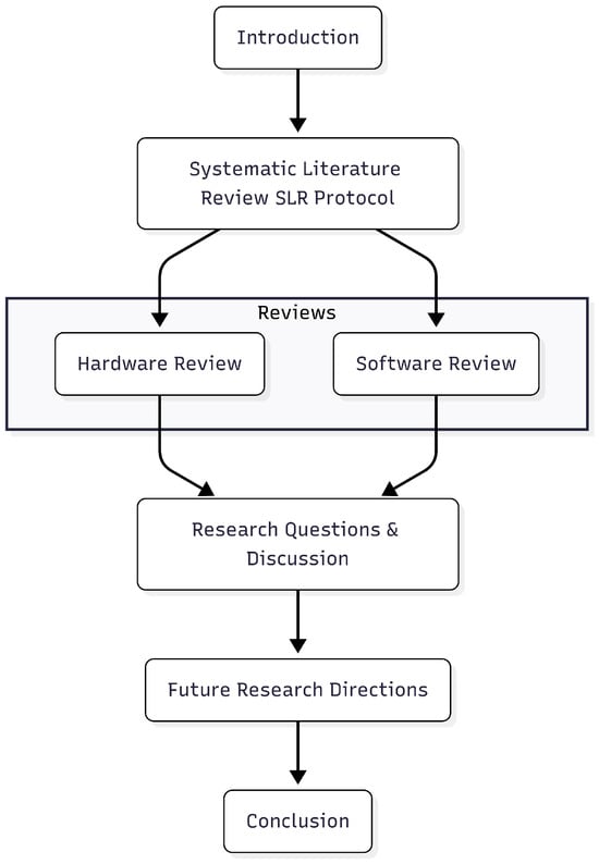 In this paper, we conduct a systematic review to introduce the state-of-the-art for both the hardware and software elements of SR systems, focusing on the past decade of research. We chose a systematic review because it is a transparent and structured method to compile and evaluate research findings on a specific topic or question. The aim is to minimize the bias associated with single studies and non-traditional reviews [11]. A systematic review “renders itself amenable for replication” [12]. In contrast to previous reviews that treat hardware and software separately, our review illustrates the interplay between the two. We compare different hardware designs and software systems that embody Swarm Intelligence, such as the Robot Operating System (ROS), and then we note major trends, challenges, and potential directions for standardized and optimized SR systems for future applications. As illustrated in Figure 1, the rest of this article is organized as follows: in Section 2 we present the SLR (systematic literature review) protocol, including research questions, exclusion and inclusion criteria, and how we performed the protocol; in Section 3, we then conduct a hardware type review of SR, differentiating the hardware components of SR (sensors, actuators, communication acquisition modules, and power source) which differed across SR types. Section 4 explores the software used in the field of SR. Section 5 answers the research questions and synthesizes the key trends and challenges in the SR research field, focusing on standardization and cost-effective solutions. It also explores future directions, including machine learning integration and energy-efficient designs. Section 6 explores future research directions and, finally, Section 7 provides the conclusion.