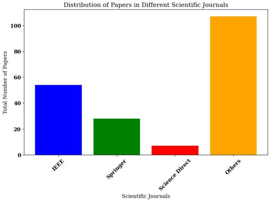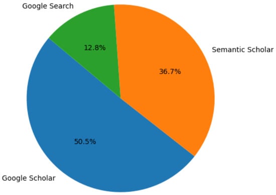 Keyword selection was based on the study subject and applied to paper titles. In Google Scholar and Semantic Scholar, the following keywords were used: (swarm and (robot or robots or robotics) and (design or hardware or software)) + how to create an SR. In Google search engine, the following was used: hardware design implementation of Swarm Robots. Figure 2, Figure 3 and Figure 4 illustrate the entire process, including the distribution of the articles with respect to the search engines, the scientific journals, and the focus area.
