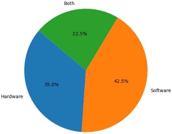 Distribution of the 40 selected papers regarding their focus area (14 hardware, 17 software, 9 both hardware and software.