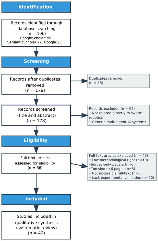 Following PRISMA style [13] and after applying the criteria outlined in Section 2.2 and Section 2.3, 40 out of 196 papers met the requirements, representing 20.41% of the total (see Figure 5).