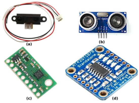 Sensors used in SR. (a) Sharp GP2Y0A21YK IR proximity sens [19]. (b) HC-SR04 Ultrasonic Distance Senso [20]. (c) LSM303D 3D Compass and Accelerometer Carrier with Voltage Regulato [21]. (d) Adafruit Standalone 5-Pad Capacitive Touch Sensor Breakout—AT42QT1070 [22].