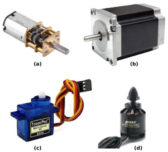 Locomotion mechanisms used in SR: (a) DC 6V Gear Motor High Torque [45]. (b) Stepper motor [46]. (c) TowerPro SG 90 Micro Servo Motor [47]. (d) EMAX Multicopter motor MT2213 [48].