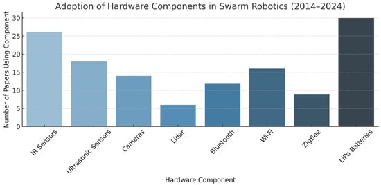 While the software is the intelligent core, providing a virtual environment that governs the robot’s operations, it is the hardware that executes the instructions dictated by the software, translating them into physical actions. The challenge with hardware is the significant variation required for different environments: in the air (aerial SR), on land (terrestrial SR), or underwater (aquatic SR). An example of terrestrial SR is illustrated in Figure 6. The hardware variations in Swarm Robots are also driven by the specific requirements of the task, as demonstrated by the experimental results of Salman et al. [16]. For example, cameras and vision sensors are more compatible with navigation tasks, while infrared or thermal sensors are better suited for rescue operations, and chemical sensors are useful for environmental monitoring. Furthermore, building SR systems under economic constraints differs significantly from building them without such constraints, as hardware prices vary, and the hardware differs between homogeneous and heterogeneous SR systems [17]. As noted by Salman et al. [16], the hardware specifications of each individual robot, the design of the control software orchestrating their behavior, and the optimal swarm size are heavily contingent upon the distinctive nature of the collective mission at hand, as well as the economic constraints imposed on the project. While “a universal swarm design methodology does not exist” [16], a general hardware architecture is common across most swarm robots.