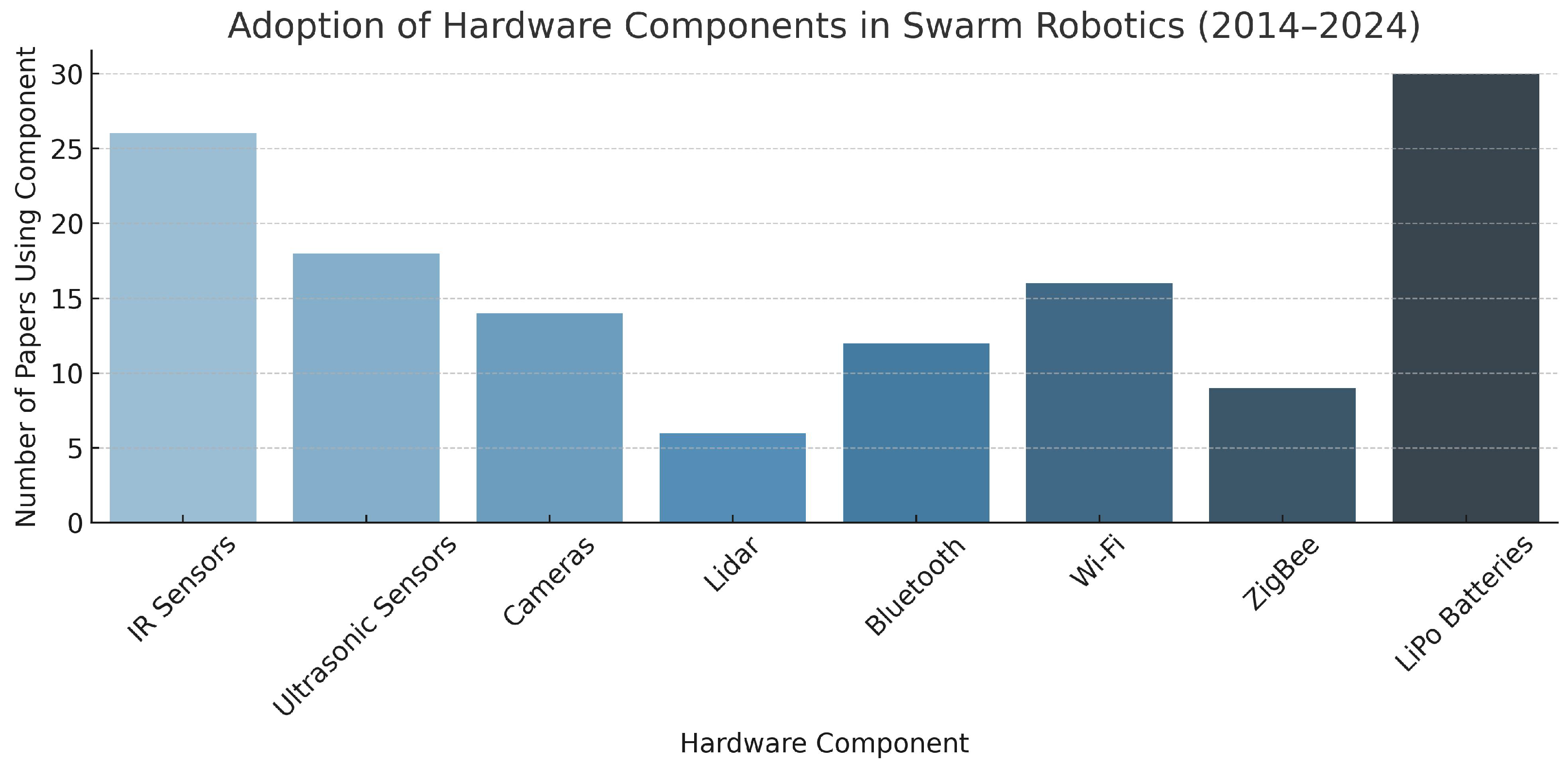 IR Sensors (long/short) | Obstacle avoidance; short-range comms | 30 mA; 1–5 m; $5–20 | Colias [27]; S-Bot [23] | |