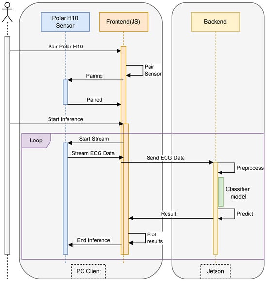 The proposed system, as shown in Figure 1 is designed to enable real-time ECG data inference from the Polar H10 sensor using an edge computing approach with the NVIDIA Jetson. The system architecture comprises three main components: the Polar H10 sensor for ECG data acquisition, a web-based interface for user interaction, and a backend server running on Jetson, which is responsible for data processing and inference. The implementation follows a client–server model, where the front-end web application communicates with the backend using JSON-based messaging.