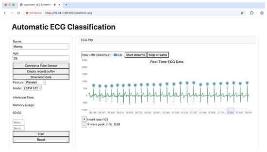 Figure 3 illustrates the real-time inference process of the automatic ECG classification system running on the Jetson Orin. The system continuously processes ECG data streamed from the Polar H10 heart rate sensor, performing real-time classification of each detected heartbeat. The Flask-based backend facilitates communication between the front end and the deep learning model deployed on the Jetson Orin, utilizing the LSTM 512 model for classification. The wavelet transform is employed as the feature extraction technique, enabling the model to capture essential characteristics of the ECG signal for accurate classification. The results are then visualized in a dynamic chart, where each detected heartbeat is labeled according to its predicted class. This approach ensures an efficient and responsive inference pipeline, making the system suitable for real-time ECG monitoring.