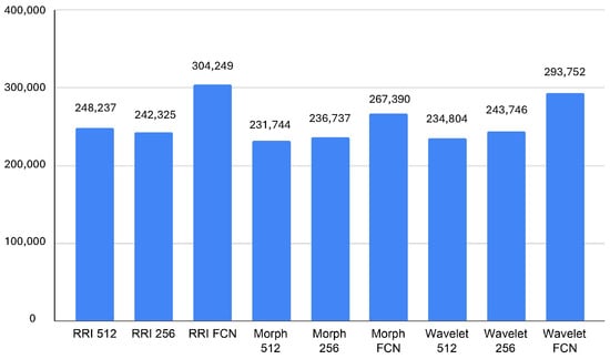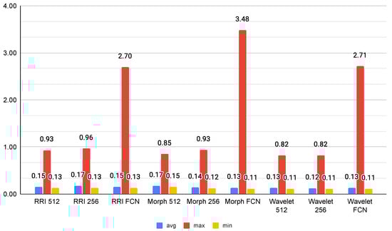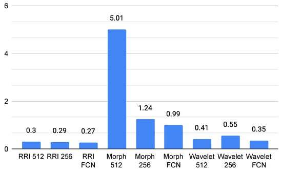 As shown in Figure 8, the inference time results suggest that Wavelet-based models exhibit the most efficient performance, with Wavelet 256 achieving the lowest average inference time at 0.1224 s, closely followed by Wavelet 512 (0.1280 s). This efficiency makes wavelet transformations a strong candidate for real-time applications, particularly in scenarios where rapid decision-making is required. Conversely, FCN-based models demonstrate the highest variability, with RRI FCN and Wavelet FCN reaching maximum inference times of 2.69 s and 2.71 s, respectively. These peaks suggest that fully connected layers introduce significant computational overhead, making them less ideal for low-latency applications.