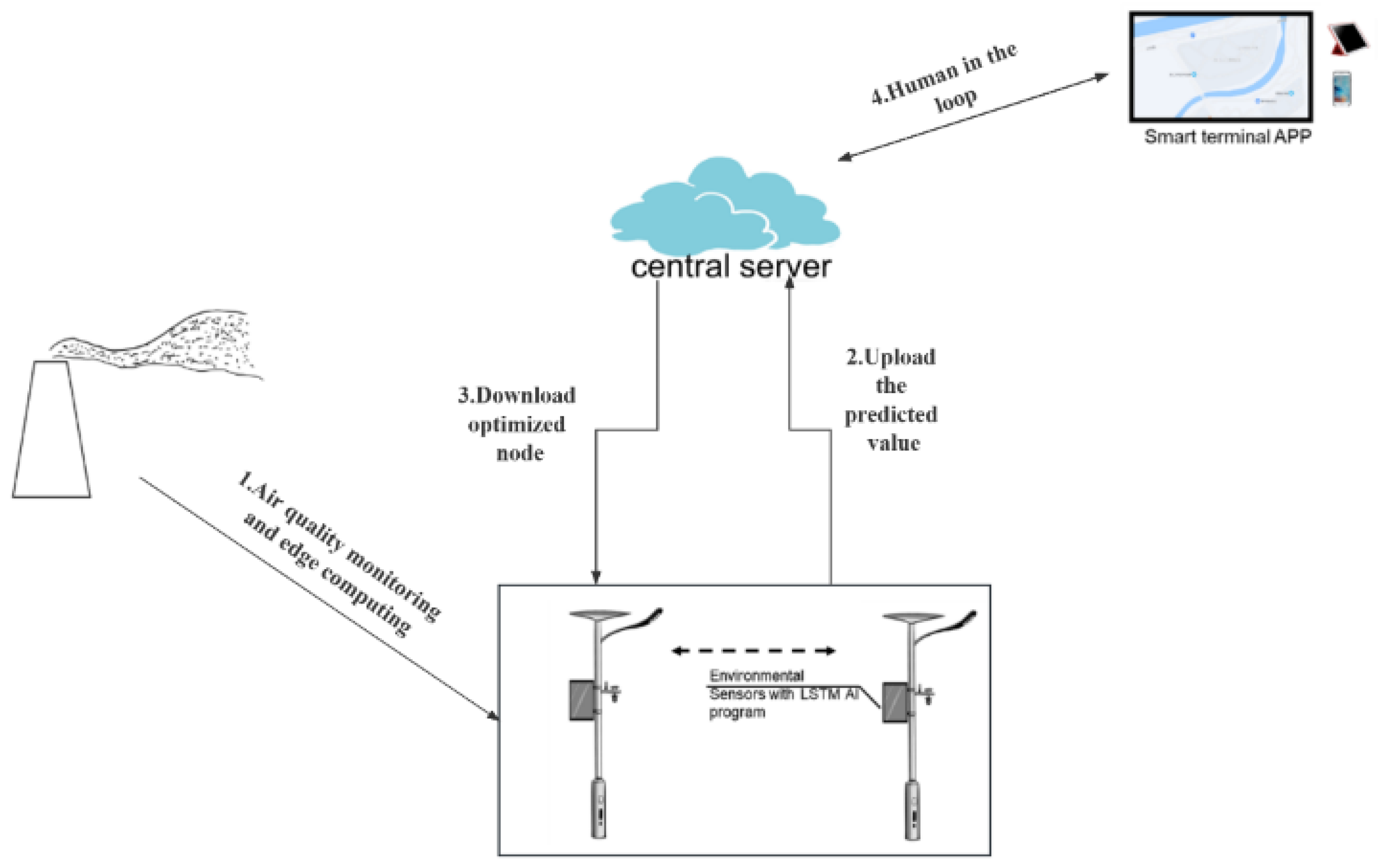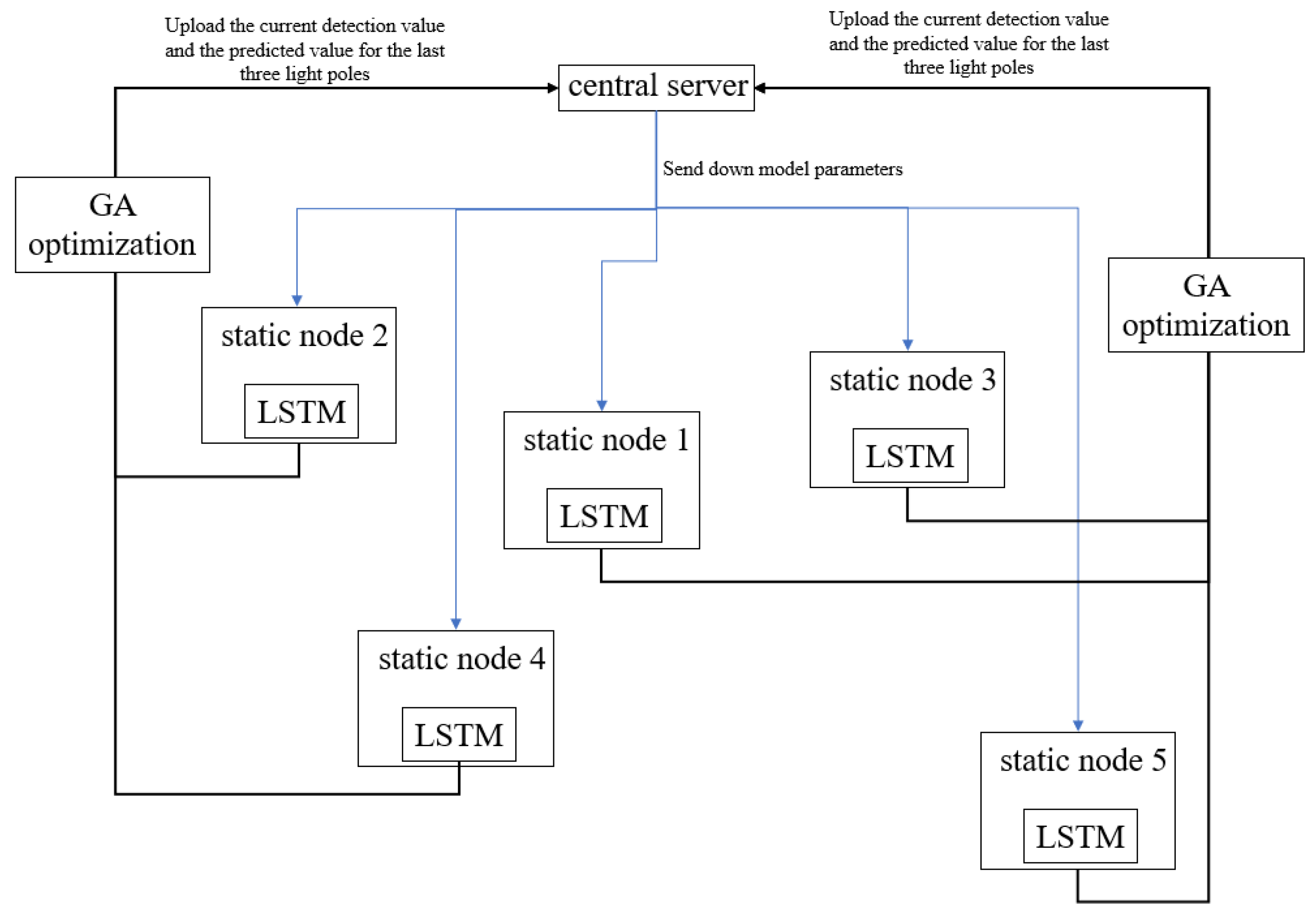 Figure 2. Each stationary node collects and preprocesses time series data using a sensor array integrated with a lamp pole. The edge computing module, equipped with the lamp pole, utilizes long-term and short-term memory modules to learn from extensive data. Afterward, the training model parameters and predicted values are uploaded to the central server, where the FedAVG, combined with the GA optimization program, is executed. The detailed design of the GA and the LSTM learning process is elaborated in