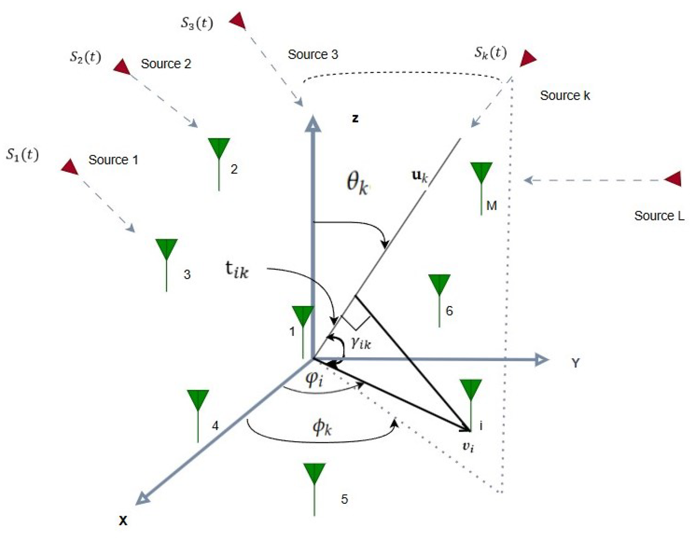 represent the elevation and azimuth angles of the ith signal, respectively. To optimize the subsequent procedures, the array outputs are initially down-converted to baseband and subsequently processed digitally to estimate the DoA. The comprehensive received signal vector, encompassing the contributions from incoming sources and additive Gaussian noise, is represented as follows: