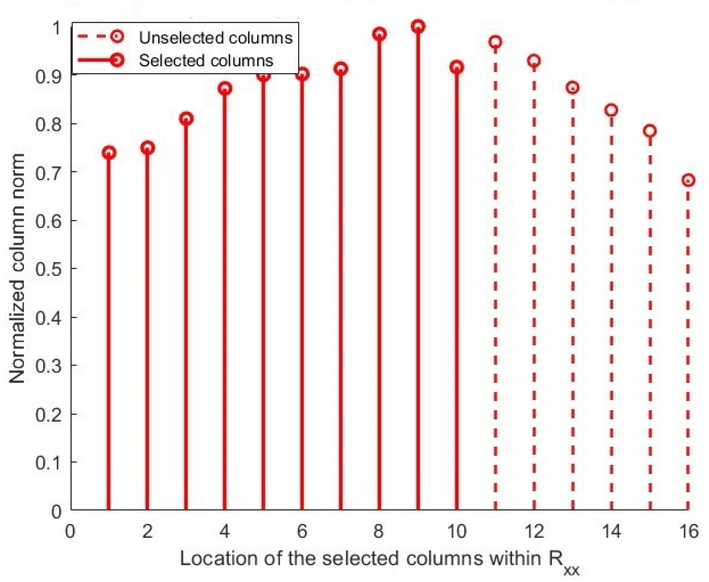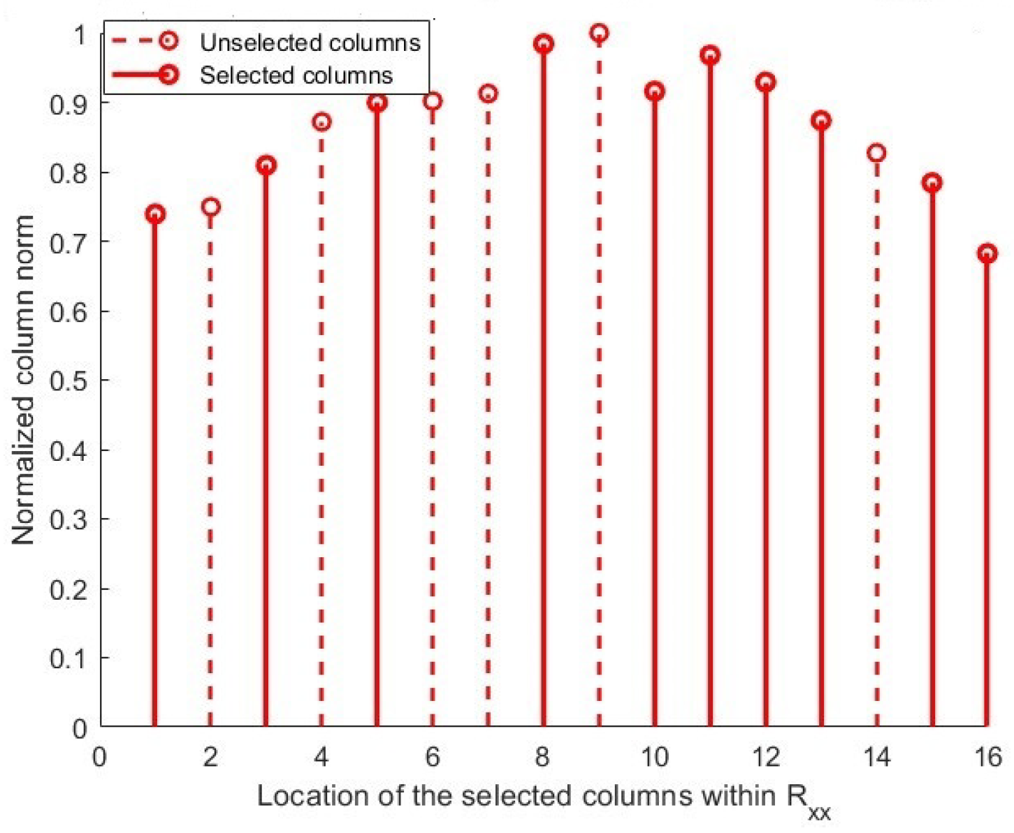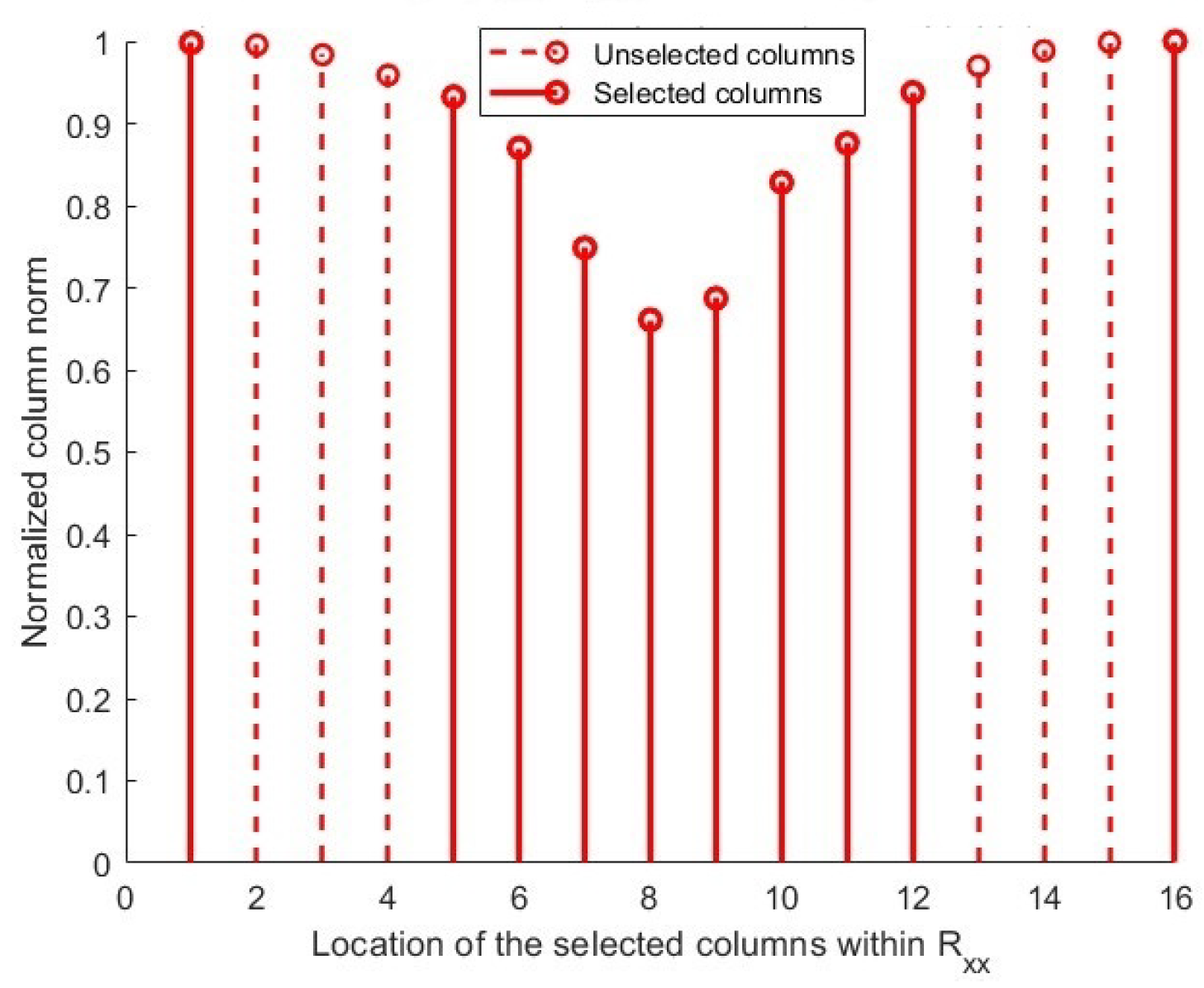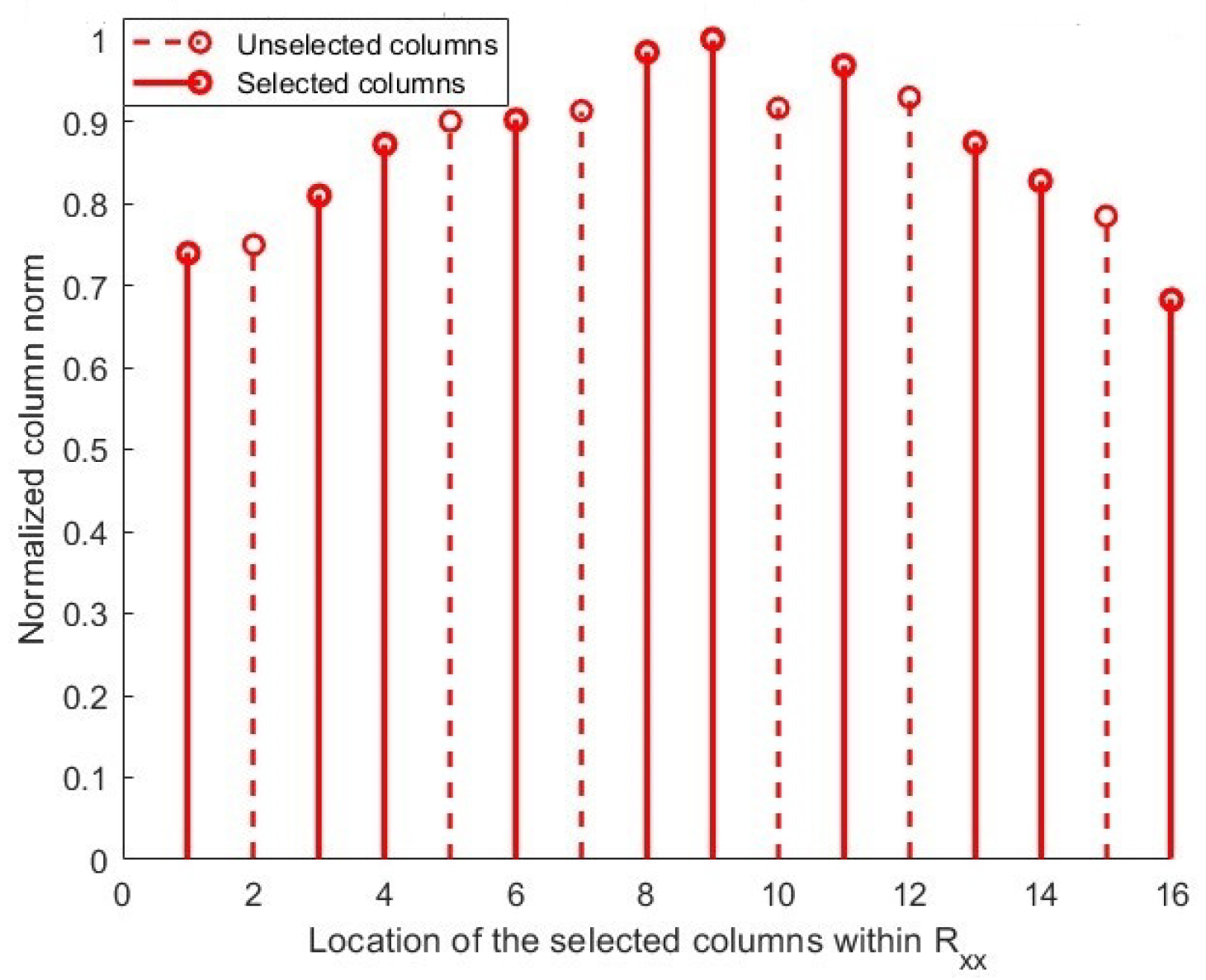 28]. The DoA of incident signals can be accurately estimated by selecting L-columns from the CM, where L represents the number of sources. Moreover, it has been demonstrated that increasing the number of sampled columns enhances DoA estimation accuracy and improves the Degree of Freedom (DoF), albeit at the cost of increased computational complexity in PM construction. Nevertheless, the authors are unaware of any optimal criterion for determining which columns of the CM should be utilized for PM construction in the literature. Typically, traditional methods use the CM’s first L columns as the default Classical sampling (CS) technique [