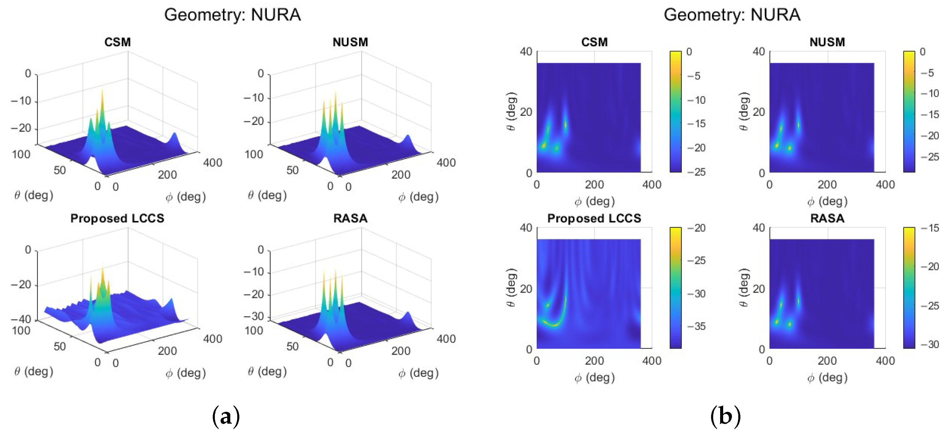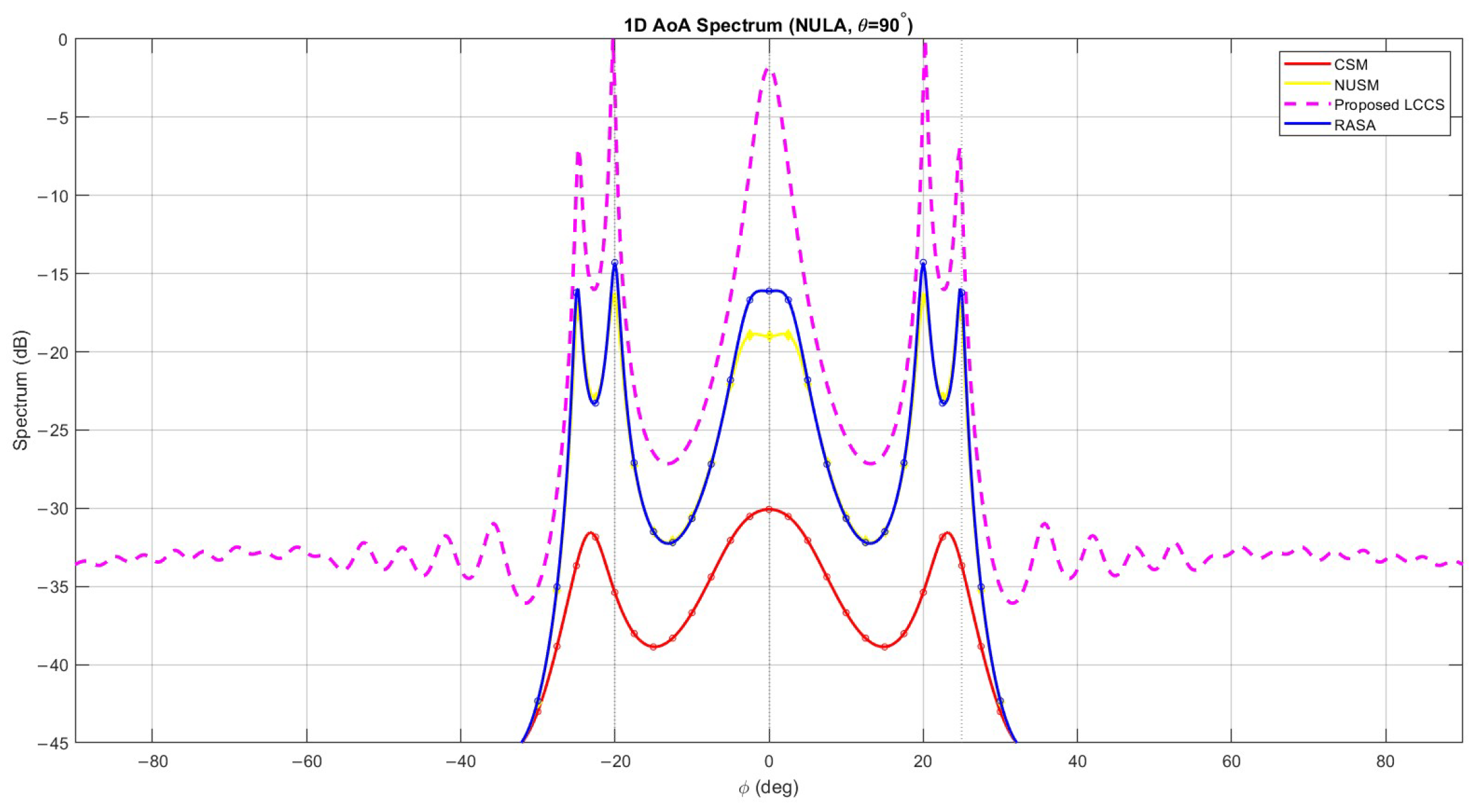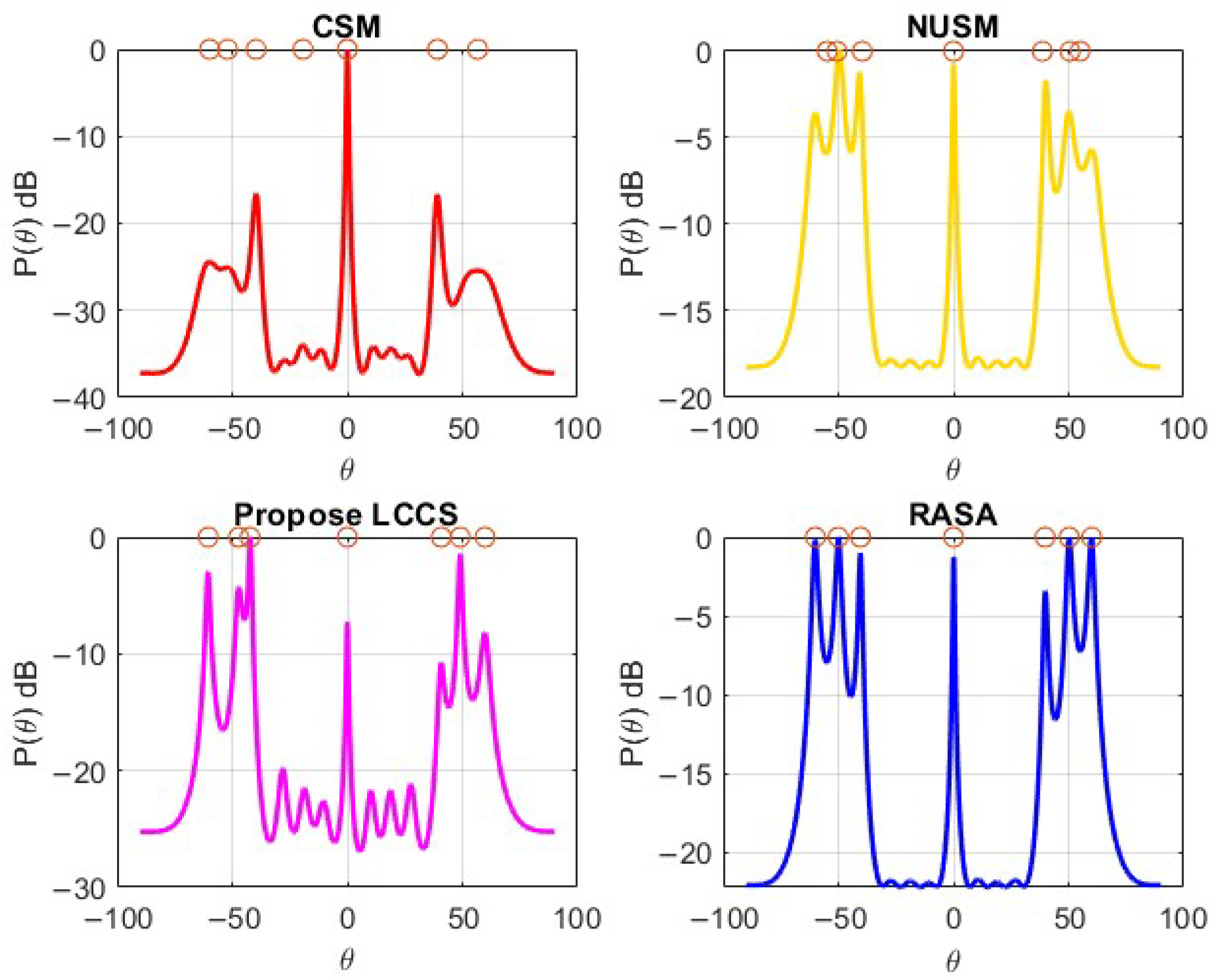 Figure 10. In particular, only RASA correctly detects the two clusters of closely spaced sources as well as all seven real DoAs. On the other hand, under-detection results from peak merging in those clusters for CSM and NUSM. The proposed LCCS shows six peaks, but it does not differentiate all closely spaced sources, and one of them is probably a false detection because of spectral noise. Because RASA was the only method among those tested that successfully resolved all sources with high accuracy and no observed false positives, the visual presence of seven peaks alone does not guarantee accurate detection.
