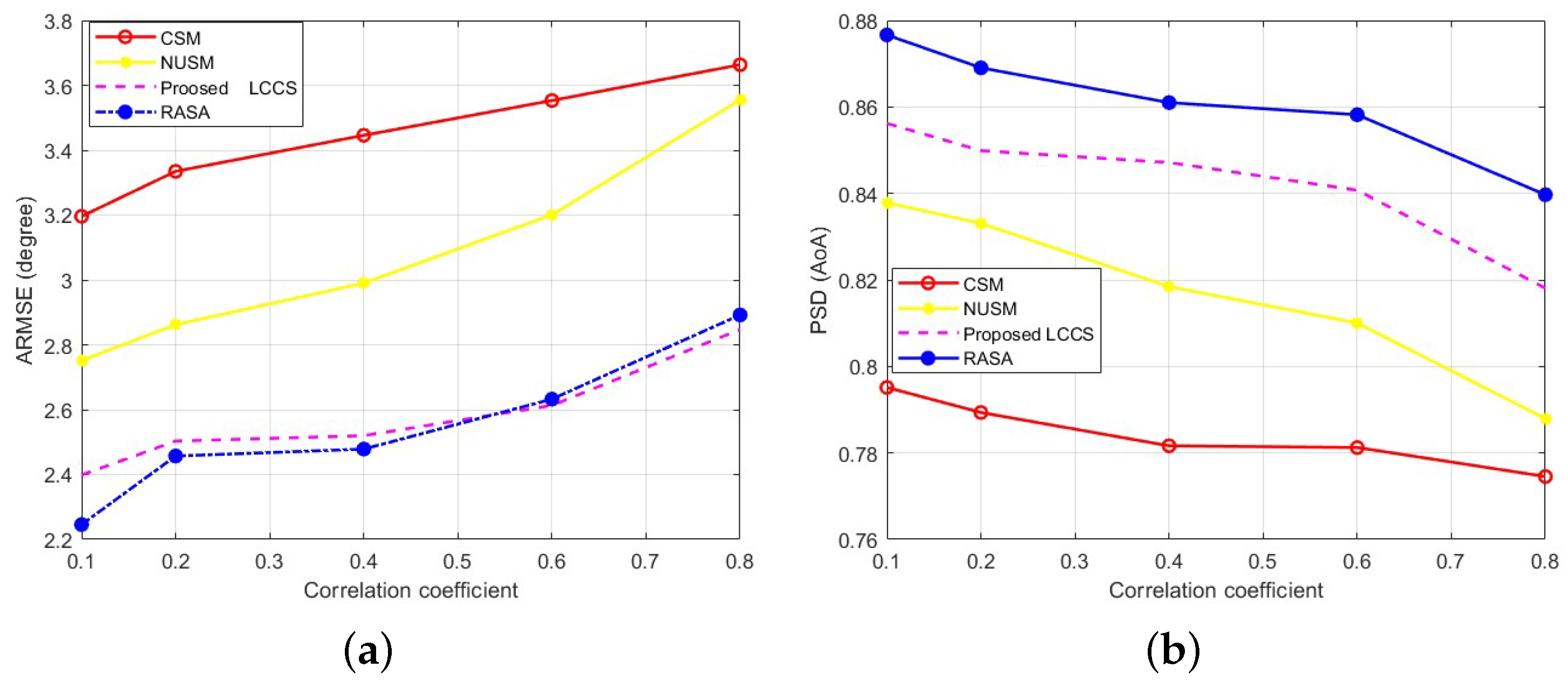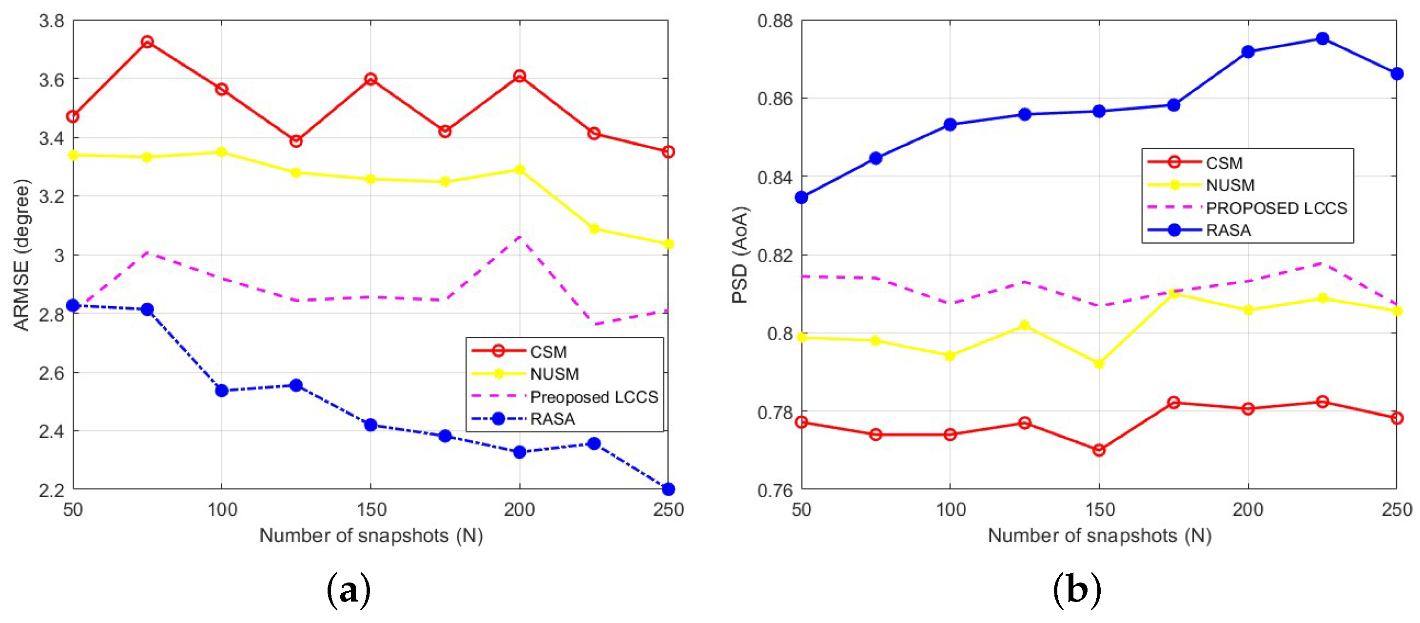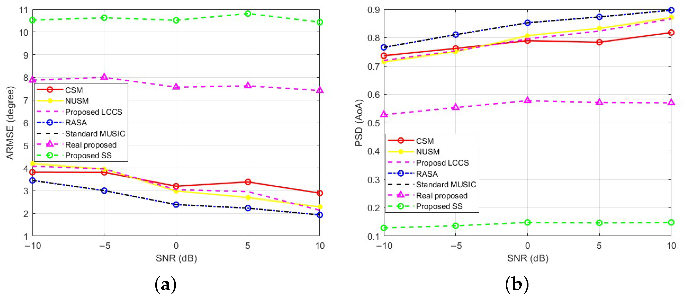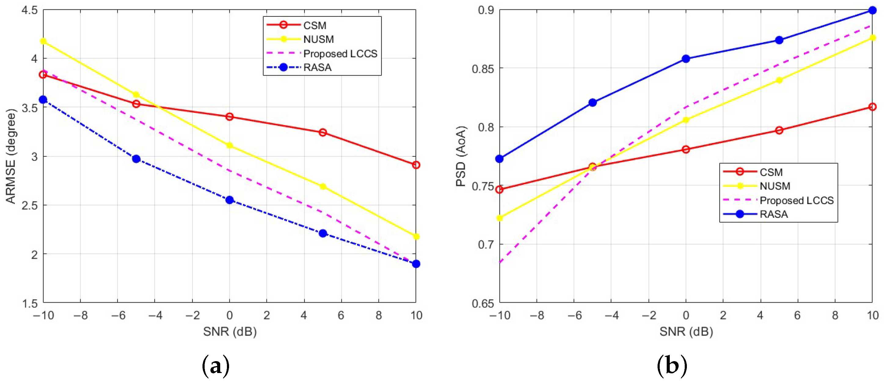 Figure 11. While RASA achieves the lowest ARMSE among the studied SNRs, Proposed LCCS comes in second, while NUSM and CSM show larger estimate errors, especially at low SNR. Likewise,