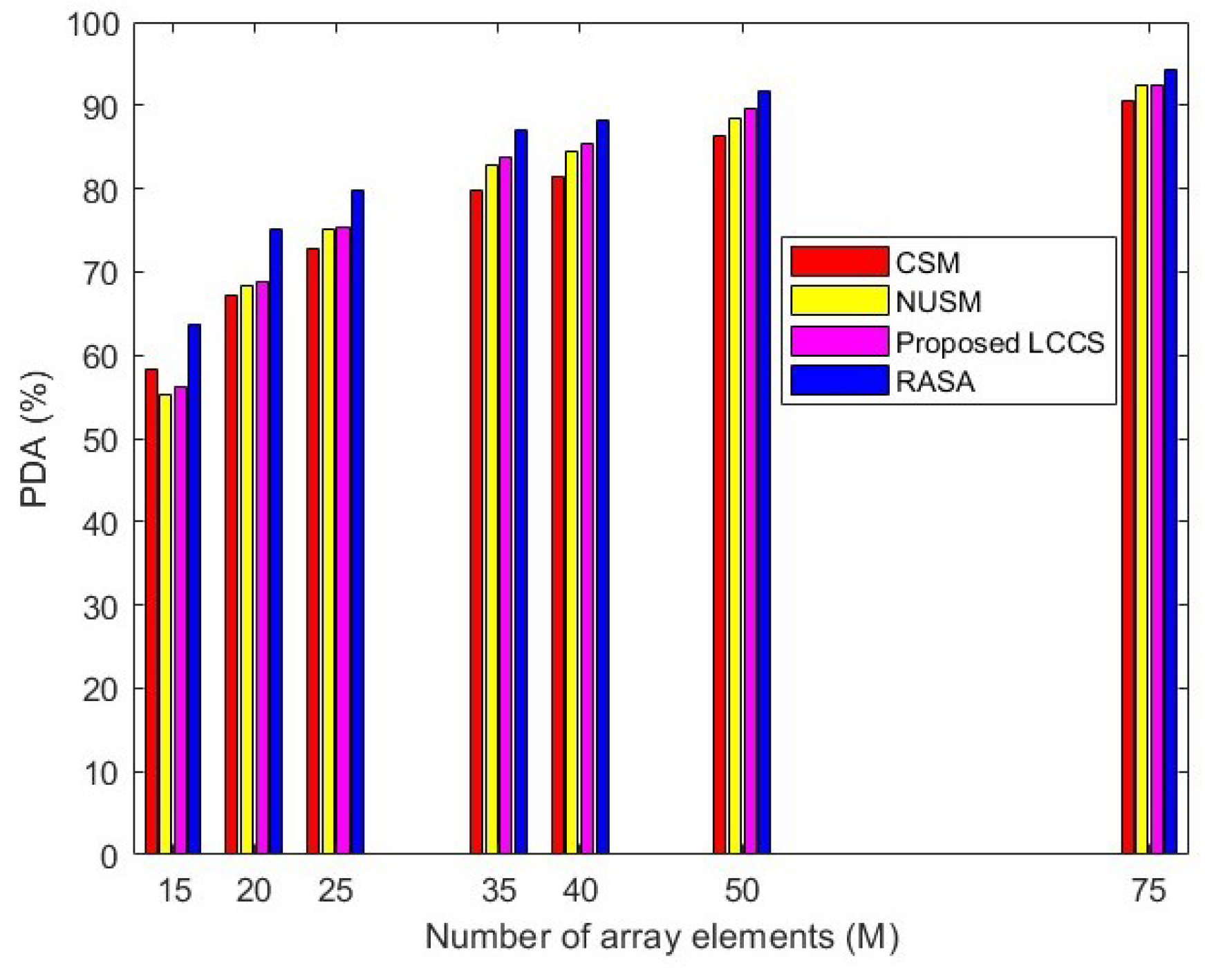 Figure 15. From the bar plot, it can be observed that a larger array size results in an increase in the aperture of the array, which in turn increases the number of detectable angles for all algorithms. The classical method exhibits comparable performance to the proposed method for a lower number of array elements. The NUSM and LCCS methods show moderate performance, with LCCS detecting more angles than the NUSM method. Notably, the RASA algorithm detects the highest number of angles, and this superior performance remains consistent for array sizes as small as 15 and as large as 75. This indicates that the proposed method outperforms the previous sampling techniques, regardless of whether the physical array size is small or large.