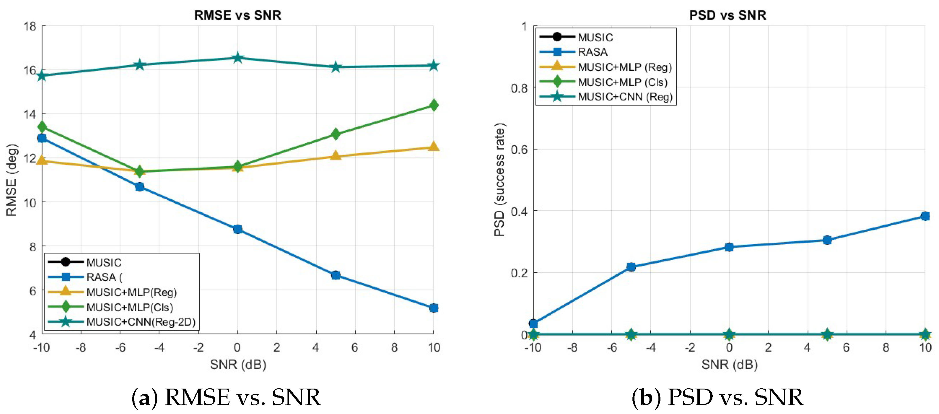 N. However, in extremely low-SNR or highly coherent situations, ML post-processors (MLP, CNN) can be useful and can generate continuous DOA estimations without grid scanning. The variations in RMSE, PSD, and runtime findings shown in