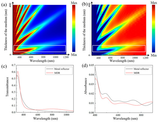To determine the optimal TiO2 thickness, we conducted a parametric scan ranging from 0 to 400 nm, evaluating its impact on transmittance and reflectance. As shown in Figure 2, increasing the thickness of the dielectric layer introduces distinct transmission enhancement bands. These bands become more pronounced, both in number and slope, as the TiO2 layer thickens. However, excessive thickness introduces multiple transmission enhancement bands within the 400–1100 nm range, leading to significant fluctuations in the transmission peaks of the Fabry–Pérot resonator across this spectral region. In contrast, decreasing the thickness makes the bandwidth too broad. To achieve a more stable and continuous transmission response and a narrower bandwidth, the optimal dielectric layer thickness is set between 50 nm and 80 nm, as highlighted by the white box in Figure 2a,b. Figure 2c,d show the reflectance and absorbance of an MDR composed of 76 nm TiO2 and 40 nm Ag. Compared to a standalone 40 nm Ag film, the addition of the TiO2 layer significantly enhances transmittance across the 500–1100 nm range, producing a smoother and more stable transmittance curve. Furthermore, simulation results reveal a marked reduction in absorption within the 400–800 nm range, further optimizing the overall performance.