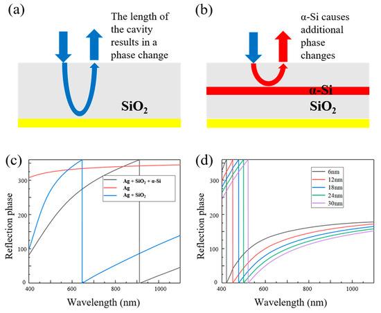 Schematic diagram of reflector phase control: (a) Ag + SiO2 and (b) Ag + SiO2 + α-Si; (c) the reflection phases for s-polarized light; (d) the reflection phases of different α-Si thicknesses for s-polarized light.