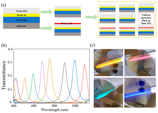 Given the extensive research and fabrication efforts on metal-based Fabry–Pérot filters by numerous researchers, to optimize the fabrication process and costs, we simplified our validation experiment by using eight filter sets to verify our proposed MSFA structure. The structure is composed of seven layers: 76 nm of TiO2, 40 nm of Ag, 90 nm of SiO2, 20 nm of the α-Si layer, SiO2 of thickness h, 40 nm of Ag, and 76 nm of TiO2. Since only the 20 nm α-Si layer and SiO2 with thickness h are varied, the fabrication process only requires adjustments to these two layers for each filter. To closely align with MSFA-manufacturing processes, all other layers were deposited in a single batch. We used thermal evaporation to deposit 76 nm TiO2, 40 nm Ag, and 90 nm SiO2 on eight substrates. Three of these were then coated with a 20 nm α-Si layer using PECVD. The remaining five filters were divided into five groups, with each group receiving a SiO2 layer of 0, 30, 60, 90, or 120 nm. The three filters with the 20 nm α-Si layer were placed into the second, third, and fourth groups for simultaneous deposition of 30, 60, and 90 nm of the SiO2 film. Finally, all eight filters underwent the final deposition of 40 nm of Ag and 76 nm of TiO2. This process substantially reduces the complexity of large-scale manufacturing. The resulting filters are shown in Figure 7a.