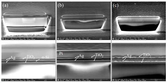 The cross-sectional SEM (FEI, Helios G4 CX) images of the filter based on MDR and phase control by the high refractive index α-Si layer inside the cavity: (a) shows the filter structure with a 20 nm α-Si film inside the cavity, while (b,c) show the structure only with SiO2 film.
