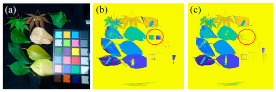 (a) Image of the test scene. (b) Classification results using only the visible band feature information for training. (c) Classification results using feature information from the 400–1100 nm band for training.