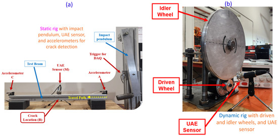 Laboratory setups for Phase I feasibility testing, showing the static impact rig with a test beam (a) and the dynamic rotating rig with an engineered-fault wheel (b).