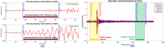 To answer the first question, a static impact rig was used, as shown in Figure 2a. This setup included a test beam instrumented with a UAE sensor and accelerometers. Beams with and without engineered faults (i.e., manufactured cracks) were excited using a repeatable mechanical impulse from a pendulum. The results provided clear evidence of UAE detection; as shown in Figure 3a, a distinct, high-amplitude acoustic emission (AE) burst was consistently recorded from the faulted beam within the theoretically calculated arrival window, a signature that was absent in the un-faulted control beam.