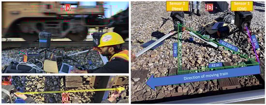 Field deployment of the UAE sensor suite. (a) Overall setup capturing data from a passing freight train. (b) Geometric arrangement of the two sensors relative to the track. (c) Measurement of the standoff distance from the railhead.