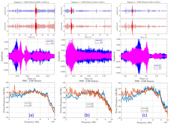Analysis of three distinct data segments from the field test. For each event (a–c), the time-domain signal and the corresponding PSD plot show a consistent pattern of high-amplitude, broadband noise in the ultrasonic frequency range.