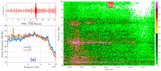 Figure 5 presents representative data from the field test. The Power Spectral Density (PSD) plots consistently reveal a flat, high-energy, broadband response that saturates the entire ultrasonic band of interest (20–80 kHz). This is precisely the frequency range where crack-induced UAE signatures were expected, leading to a direct and inseparable overlap between the potential target signal and background noise. Further time-frequency analysis (Figure 6) illustrates this phenomenon as a dense, patternless “wall of sound” where the ultrasonic spectrum is saturated with transient energy.