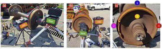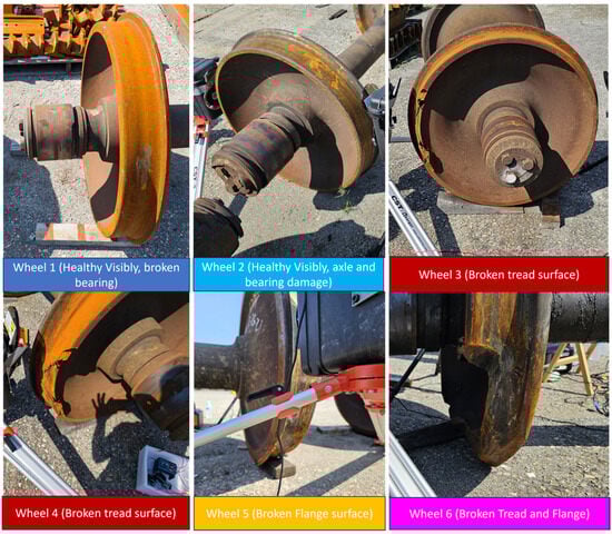 The initial group of wheels included six out-of-service wheelsets with significant structural damage. This group, shown in Figure 7, consisted of two healthy wheels, two with broken rims, one with a broken flange, and another with damage to both the rim and flange. For these tests, each wheelset was supported on wooden blocks to reduce environmental acoustic coupling and establish a clean baseline for initial signature analysis.
