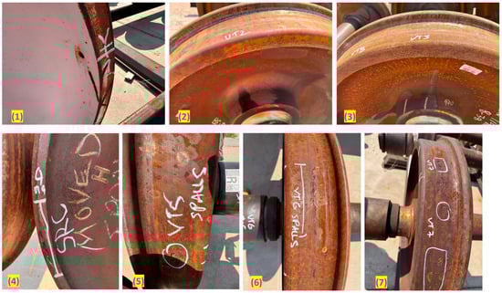 Wheelset library with incipient defects (set 1). (1) Blind holes on rim. [BH] (2,3) Healthy [H]. (4) SRC. (5) Spalling [SP] + SRC + RCF (6) RCF + Spalls [SP] (7) RCF.