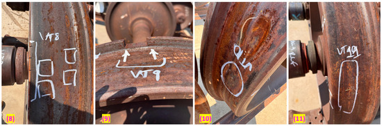 Traditional wheel inspections often use contact ultrasonic testing (UT), where probes with liquid or gel couplants are placed directly on the wheel to find cracks below the surface. This method is sensitive and reliable, but it is slow because it requires careful surface preparation and physical contact, making it difficult to apply during in-motion inspections. It also needs extra engineering efforts to keep the coupling consistent and to work at high inspection speeds [9]. To work around these problems, researchers have tested non-contact methods such as electromagnetic acoustic transducers (EMATs) and laser or air-coupled ultrasonics for wheels and rails. These approaches show promise, but they still face challenges with signal strength, background noise, and practical integration before they can be widely used [10,11,12].