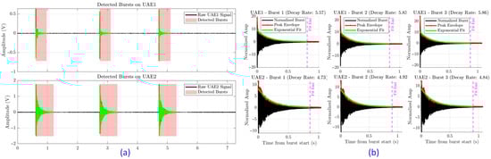 The automated analysis pipeline. (a) Automatic detection and isolation of acoustic bursts from the raw signal. (b) For each burst, the signal envelope is extracted and fit with an exponential curve to calculate the decay rate.