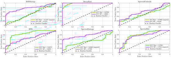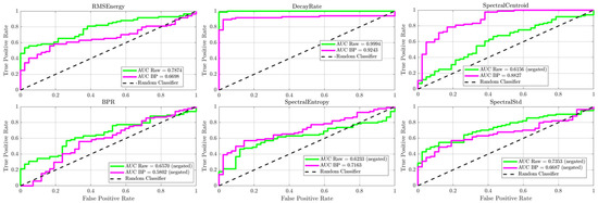 - Finally, Receiver Operating Characteristic (ROC) [30] analysis was employed to evaluate classification performance. The Area Under the Curve (AUC) served as a robust single metric of discriminative ability, where AUC = 1.0 indicates perfect classification and AUC = 0.5 corresponds to random guessing.