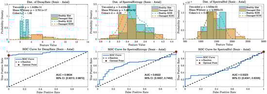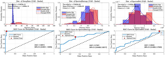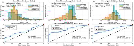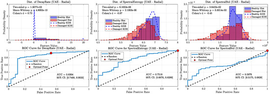 This statistical framework confirmed that the results were genuine (using p-values and non-parametric tests), quantified the magnitude of separation (using effect sizes), and provided uncertainty bounds on discriminative performance (bootstrap 95% CIs for AUC). In this way, only the features that were both reliable and distinctly different between healthy and damaged wheels were retained as strong candidates for classification.