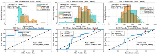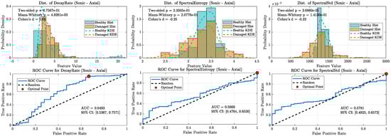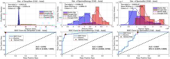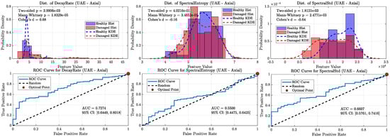 - For AUC, 95% confidence intervals were estimated with a class-stratified bootstrap (2000 resamples). First, the score direction was fixed: AUC was computed once with the raw feature and once with its negative; the larger value set the direction and was used for all resamples. In each resample, healthy and damaged cases were drawn within their own groups (with replacement) to keep the class balance, and a new AUC was computed. The 2.5th and 97.5th percentiles of these 2000 AUC values formed the 95% CI. A fixed random seed makes the result repeatable. CIs are omitted if either class has fewer than two samples.