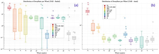 - Decay rate: This feature measures how quickly acoustic energy diminishes. It was determined by first extracting the signal envelope of the burst and then fitting an exponential curve to its decay portion [24] (Figure 11b). The main hypothesis is that internal friction and micro-slip at crack interfaces act as damping mechanisms, resulting in faster dissipation of acoustic energy and a significantly higher decay rate compared to a healthy, resonant wheel.