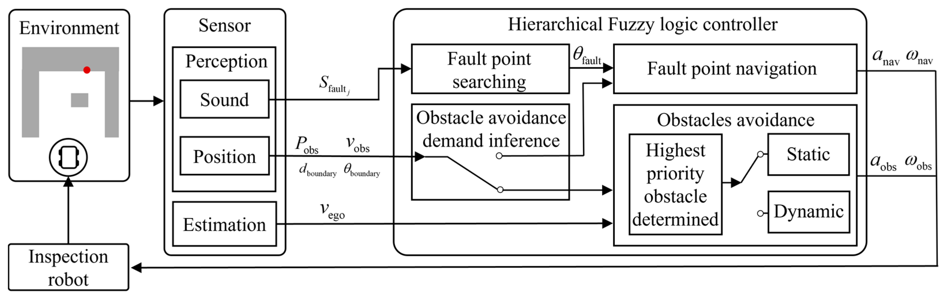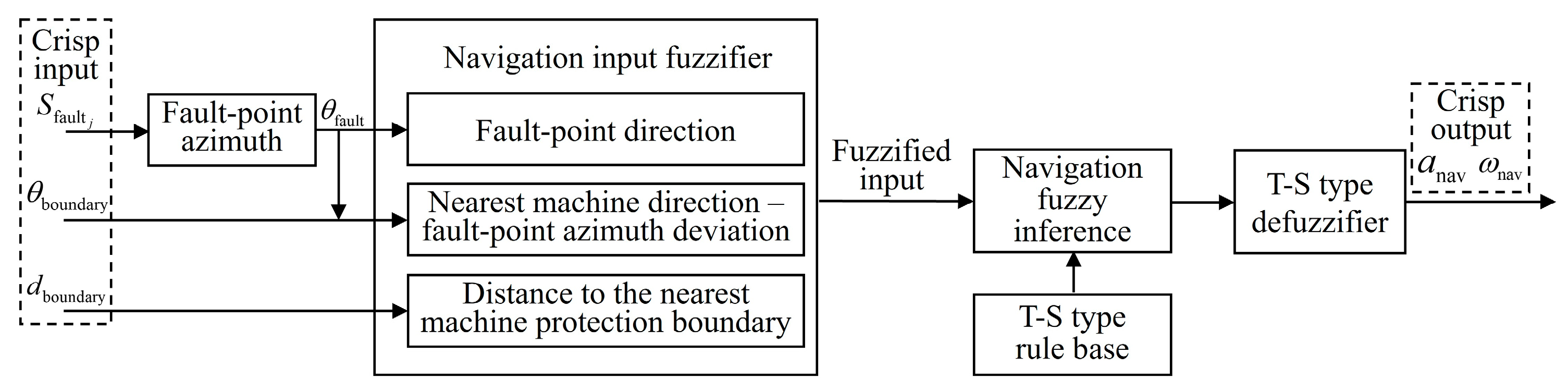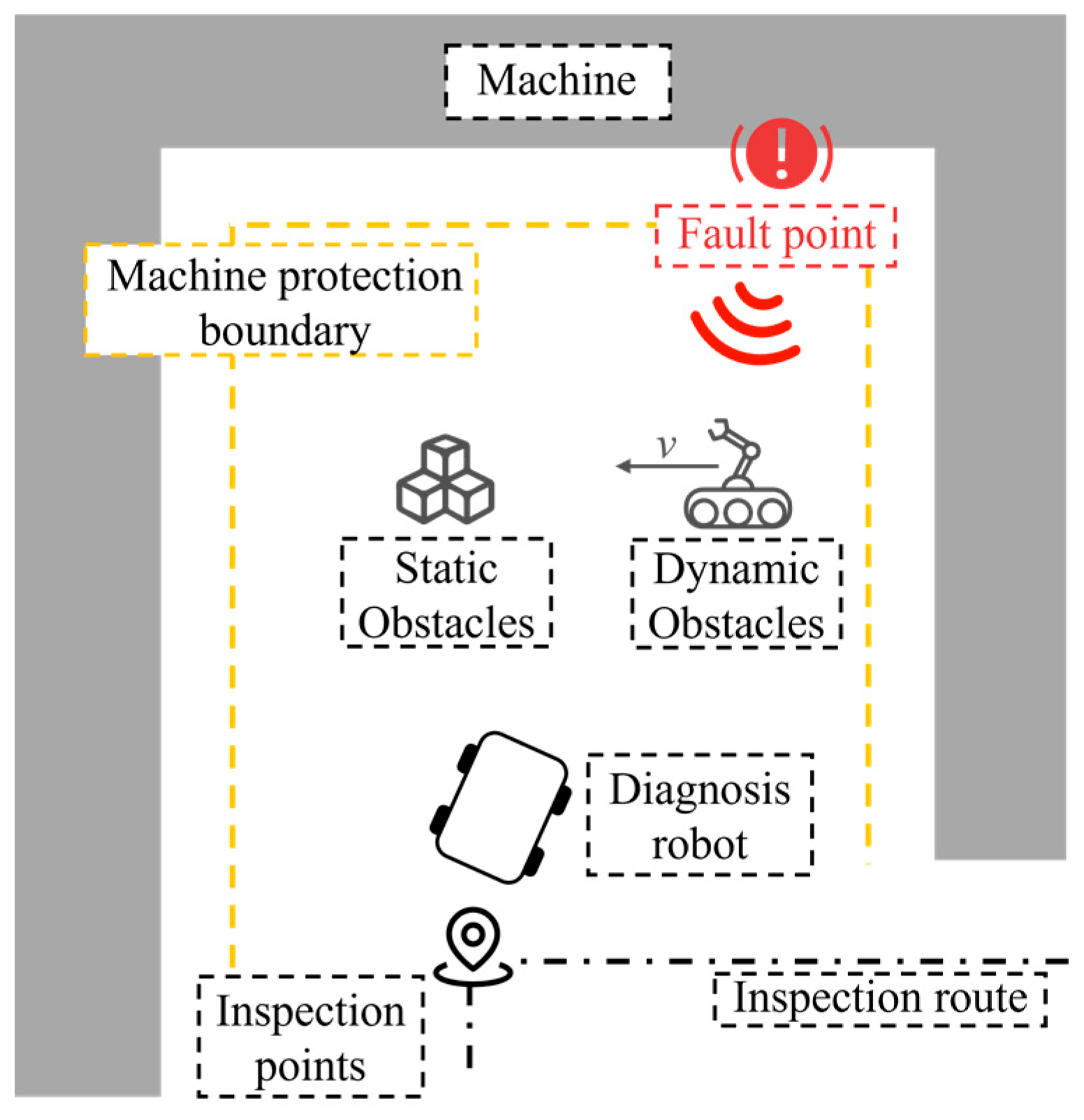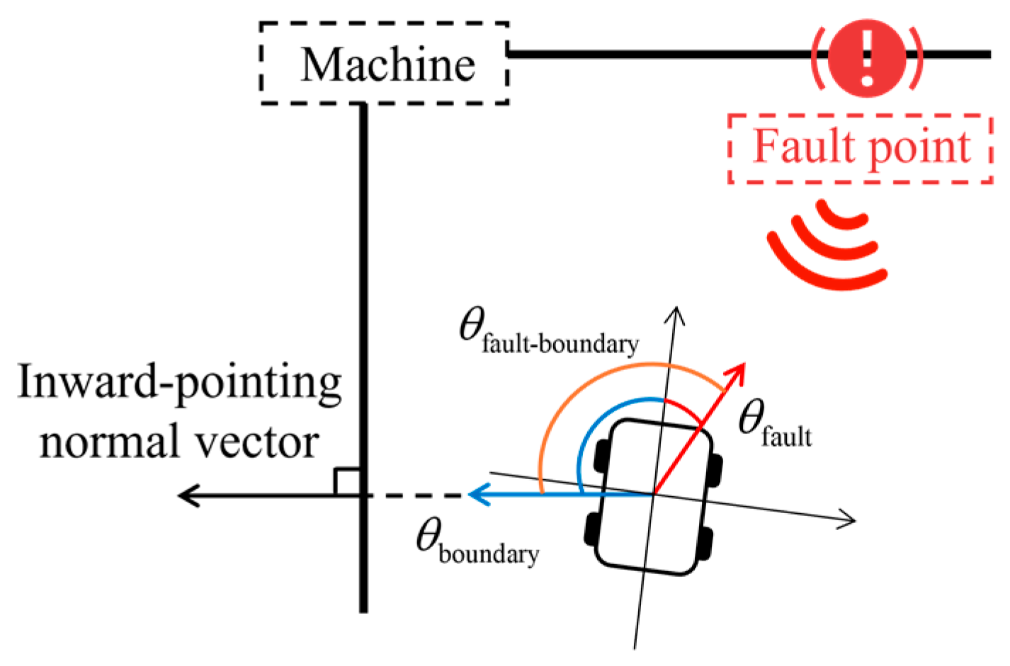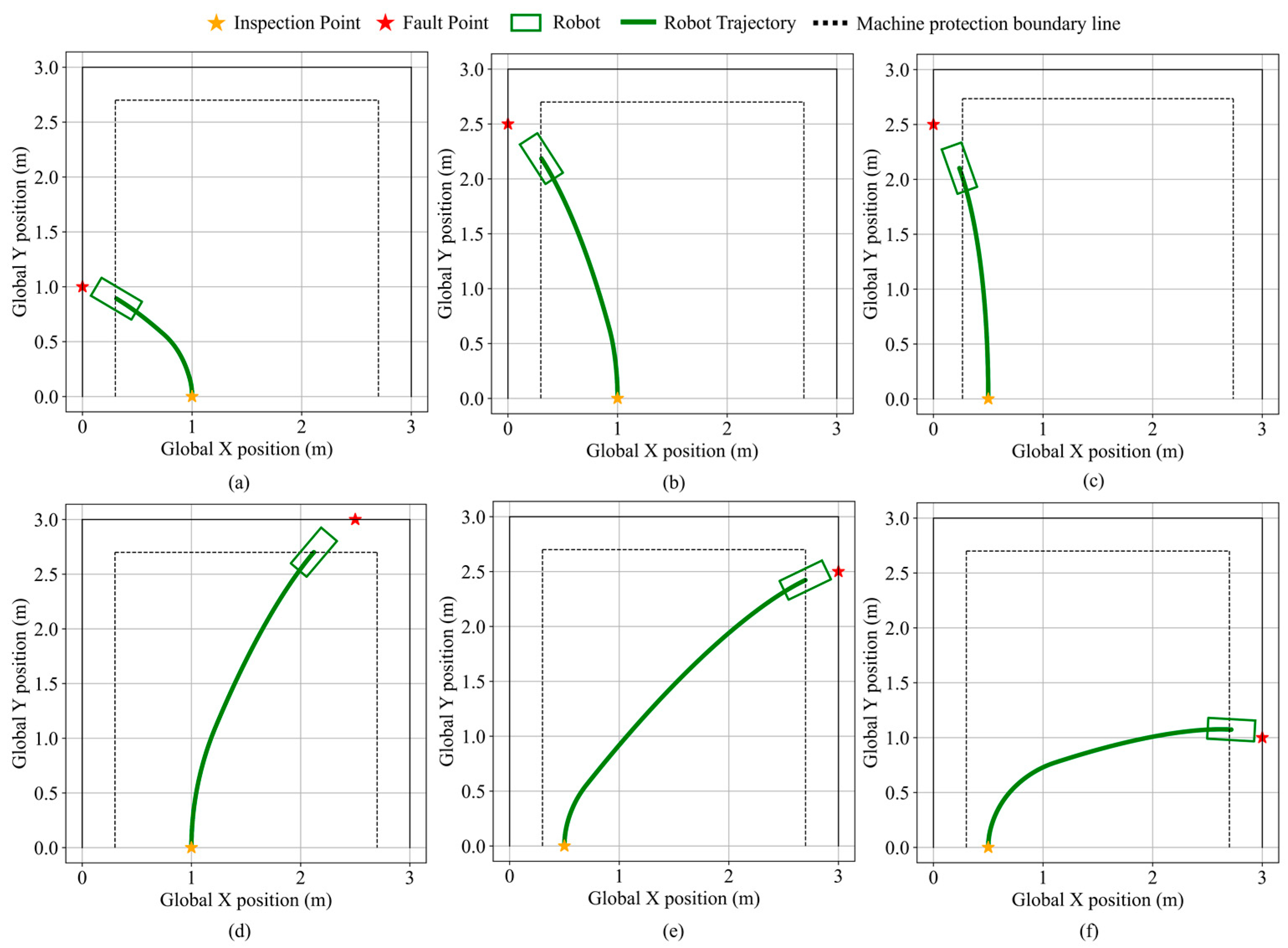 Robot state during fault point search navigation validation. (a) Close-Range navigation validation. (b) Right-boundary navigation validation. (c) Boundary-following navigation validation. (d) Top-boundary navigation validation. (e,f) Left-boundary navigation validation.
