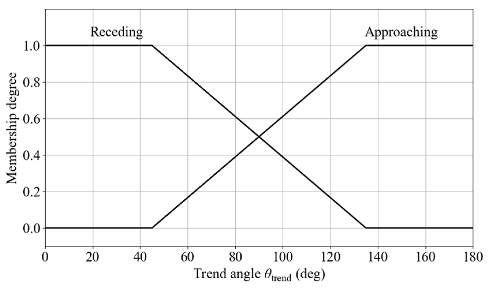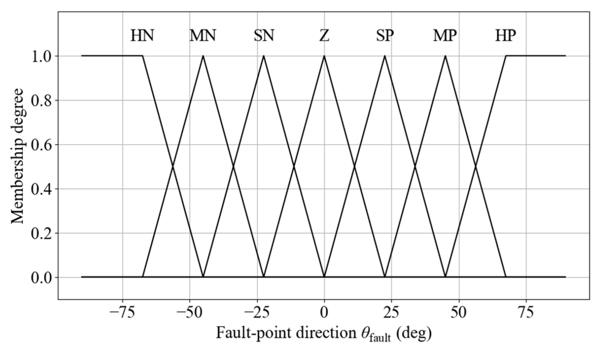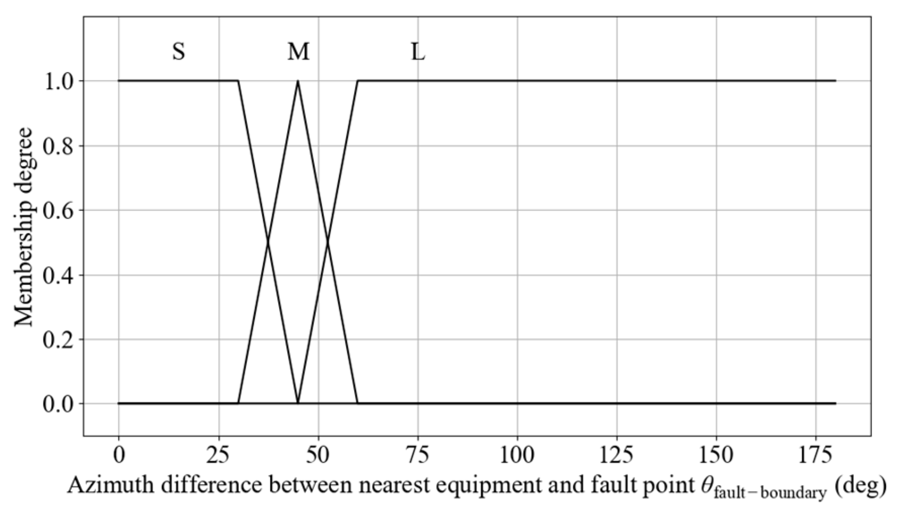 Membership functions for azimuth difference between the nearest equipment and fault point.