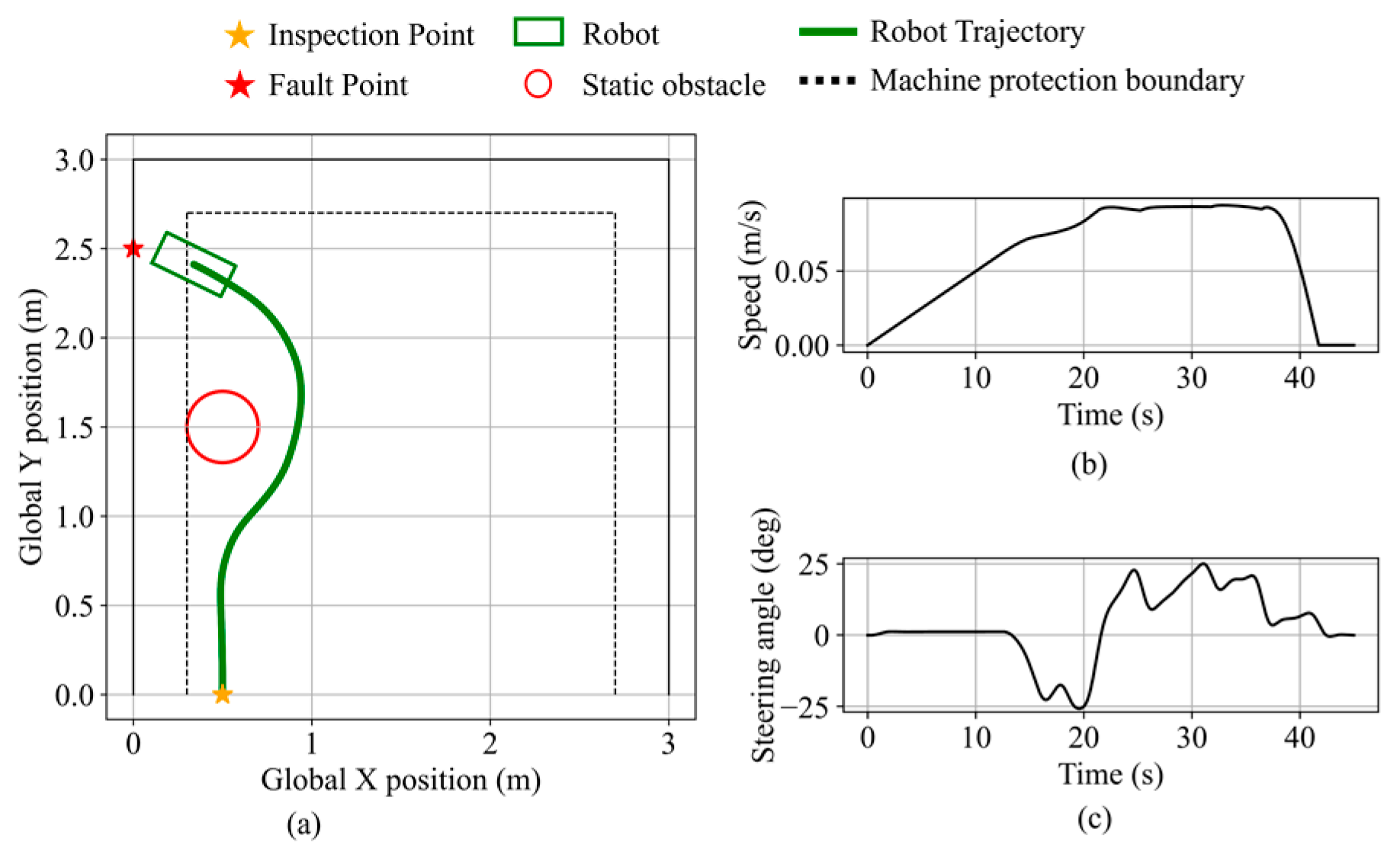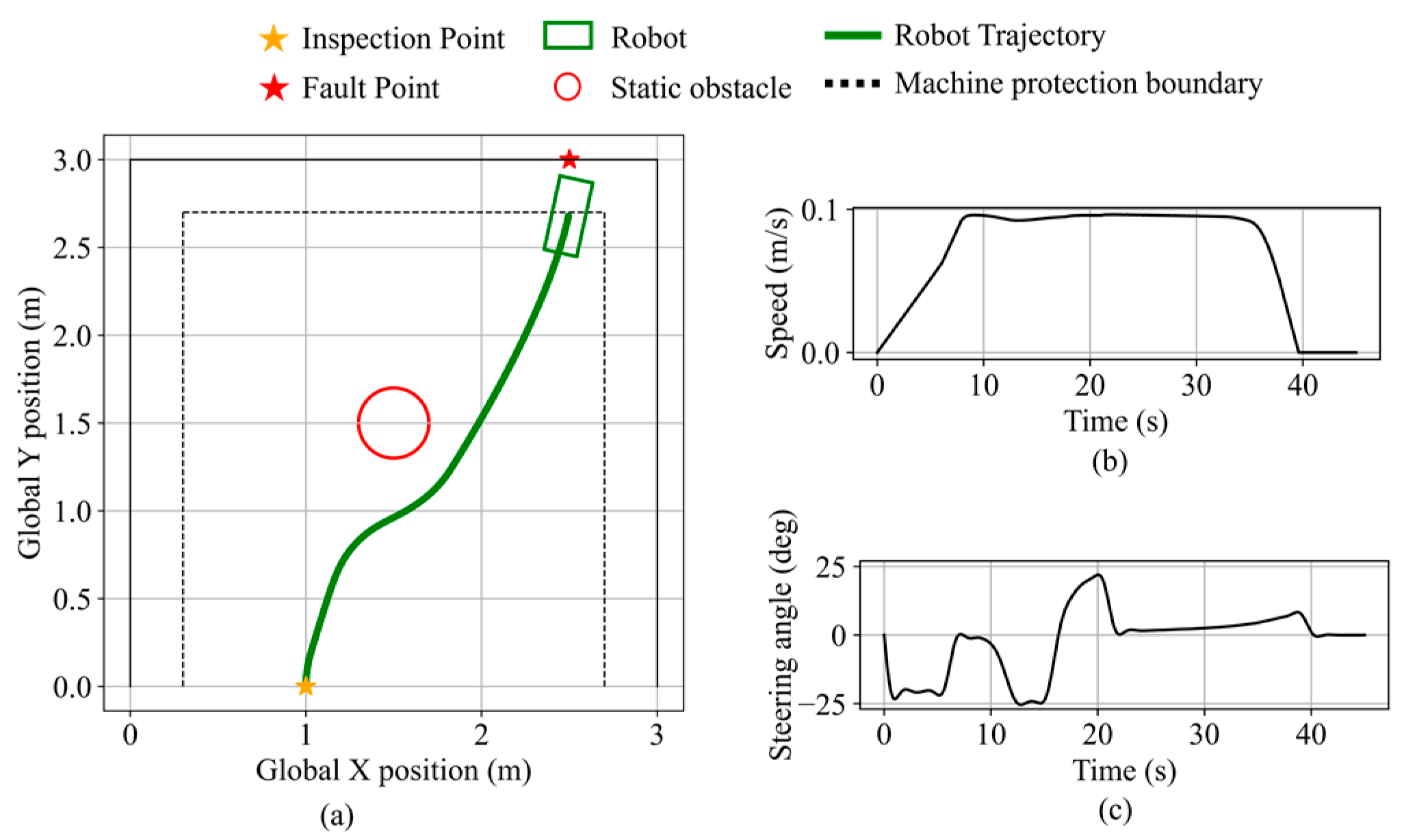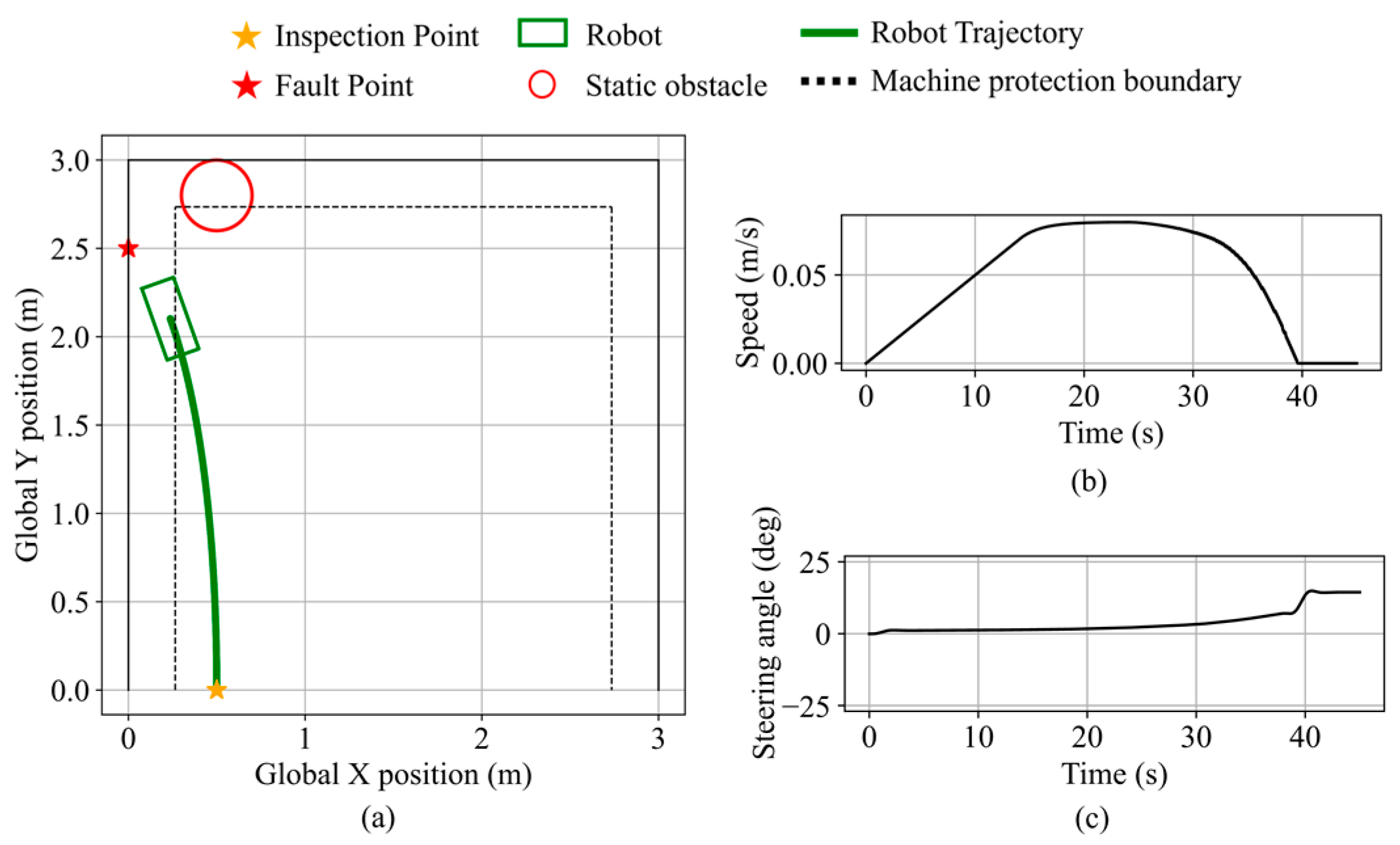 Robot states during static obstacle avoidance in validation scenario 1. (a) Robot trajectory. (b) Robot speed. (c) Robot steering angle.
