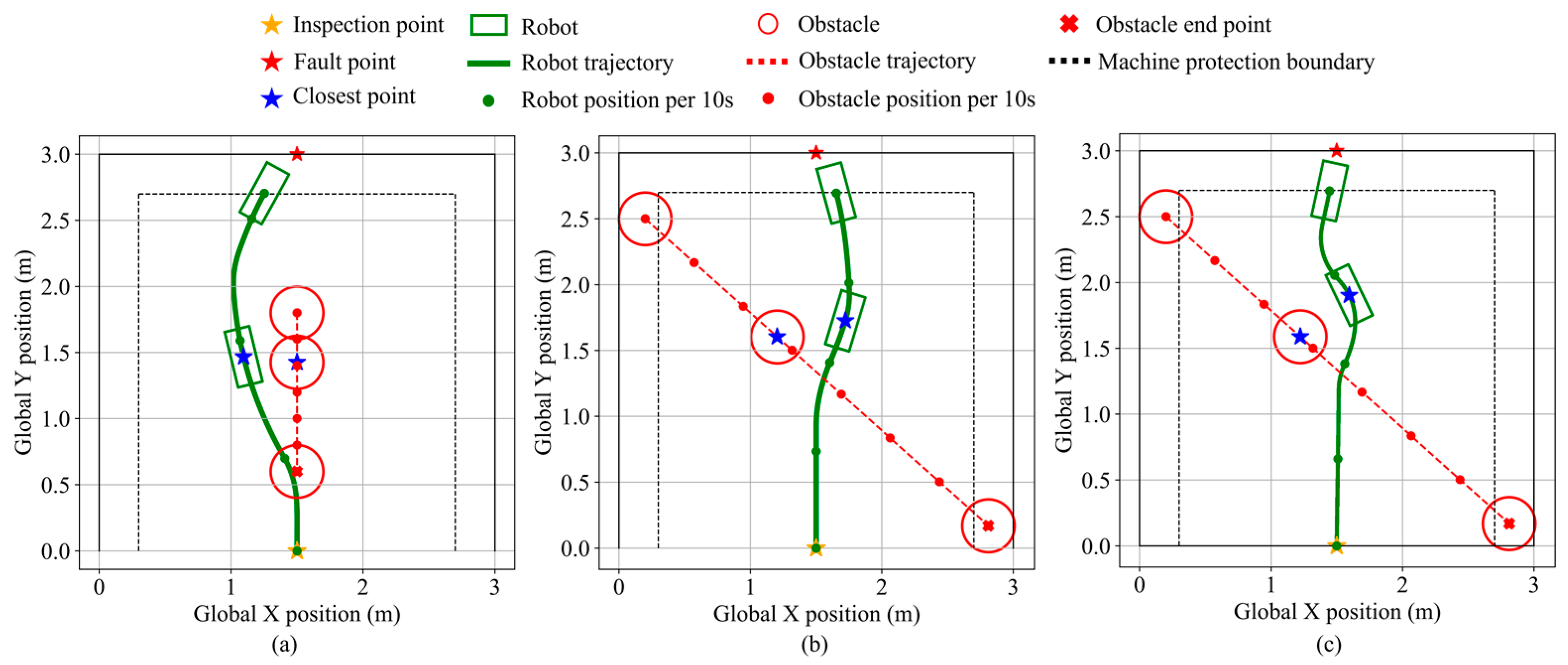Robot states during dynamic obstacle avoidance in validation scenario 1 and 2. (a) Dynamic obstacle approaching head-on. (b) Dynamic obstacle approaching from front-left. (c) MPC comparison test.