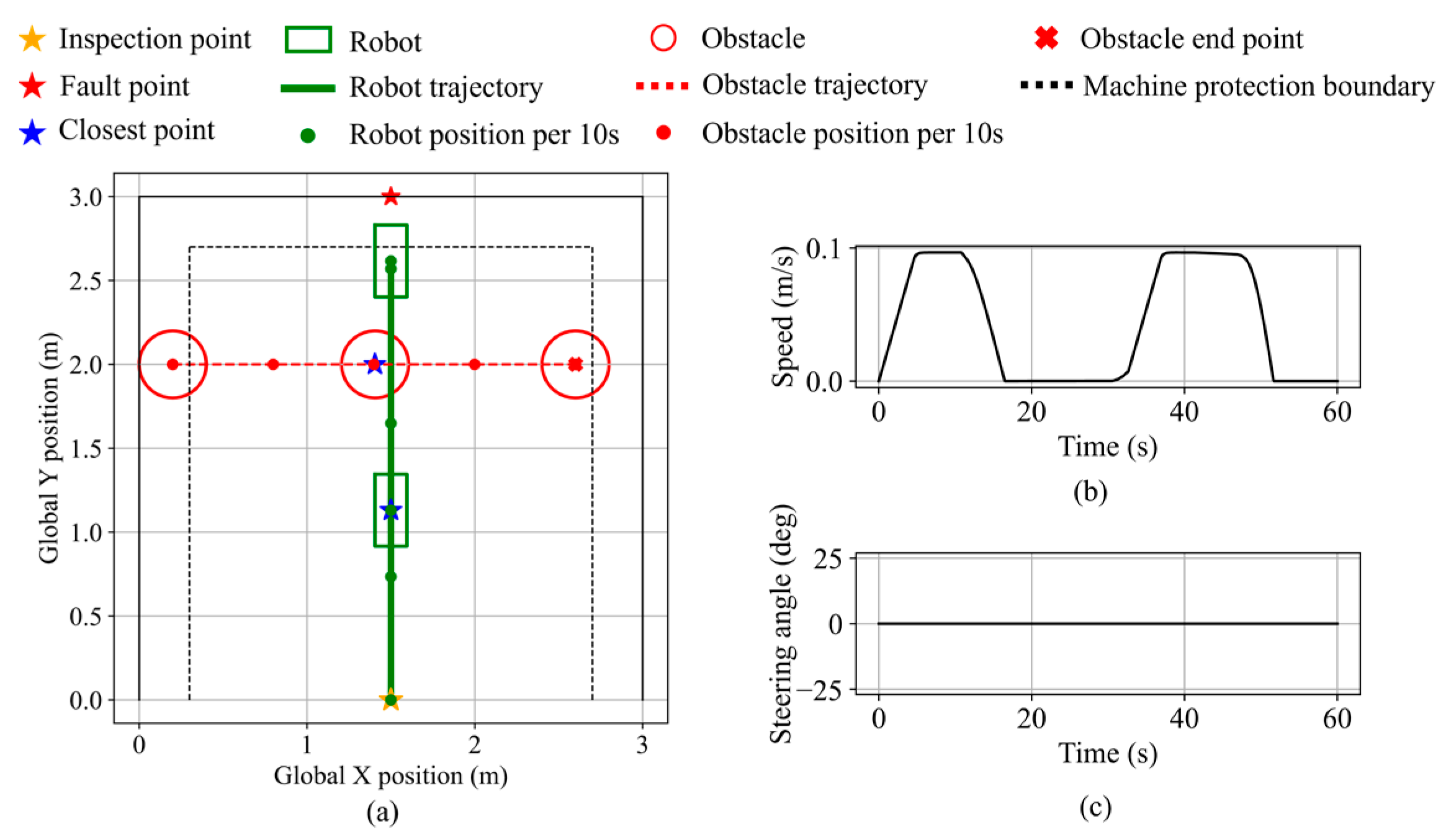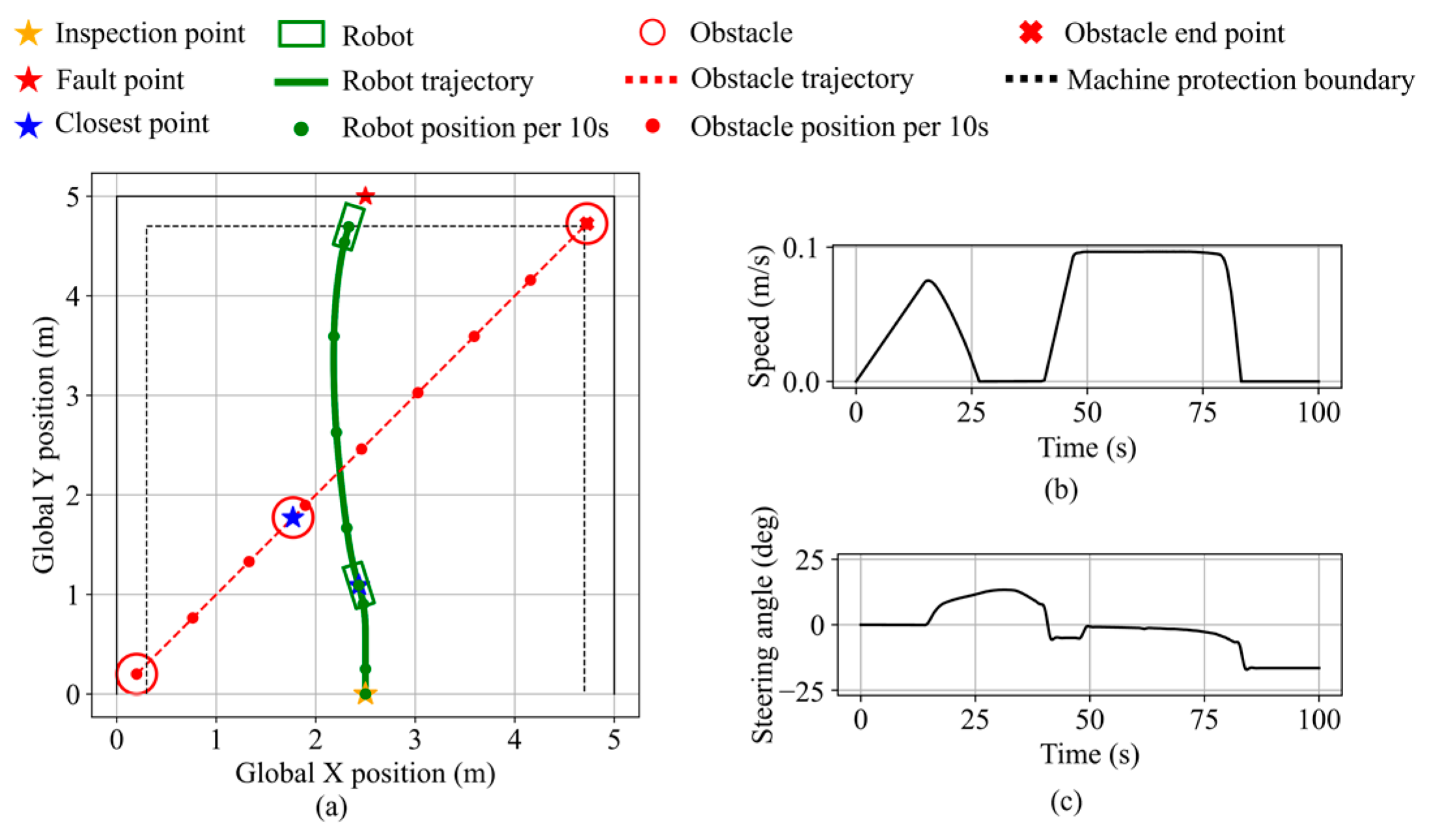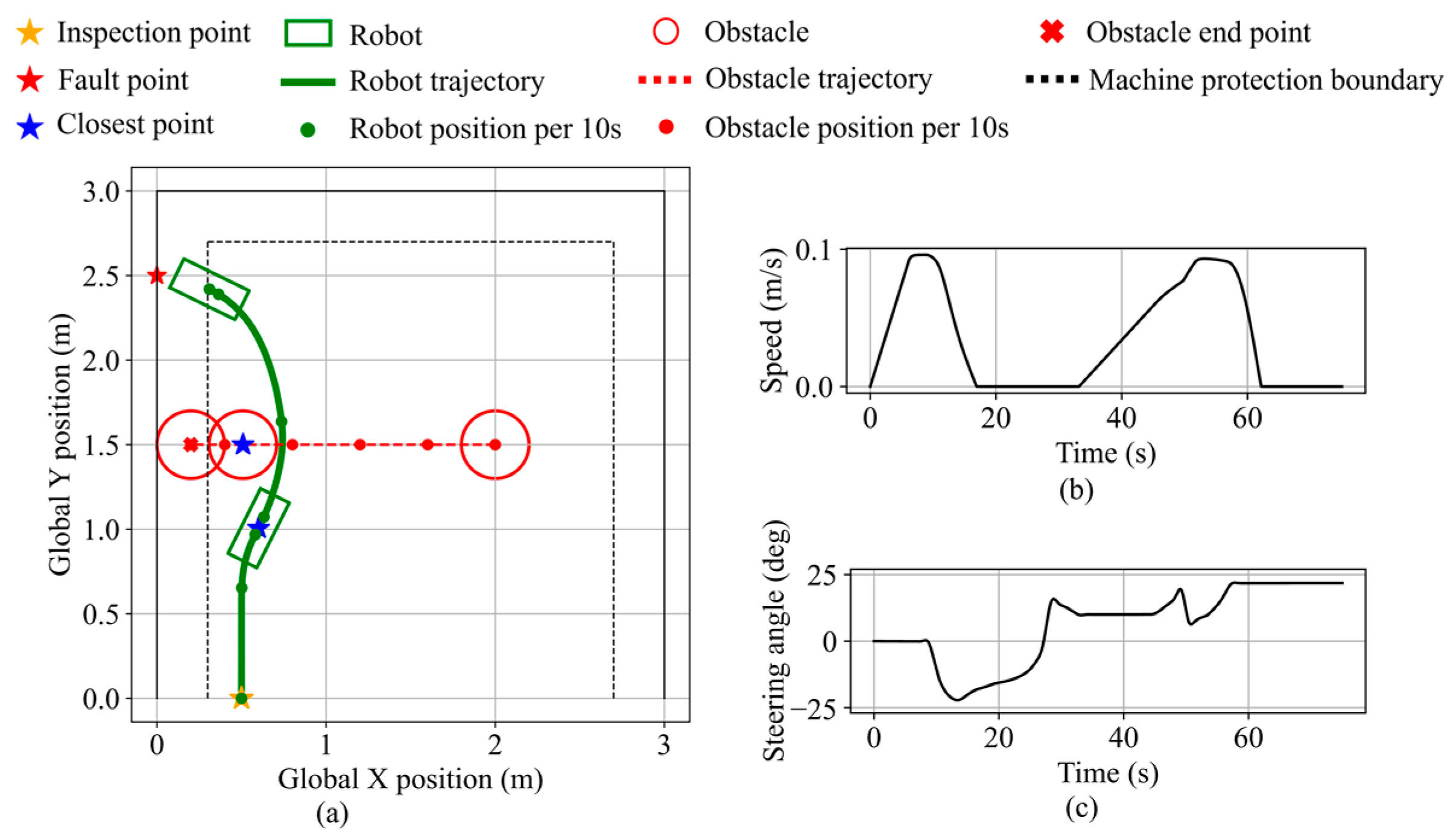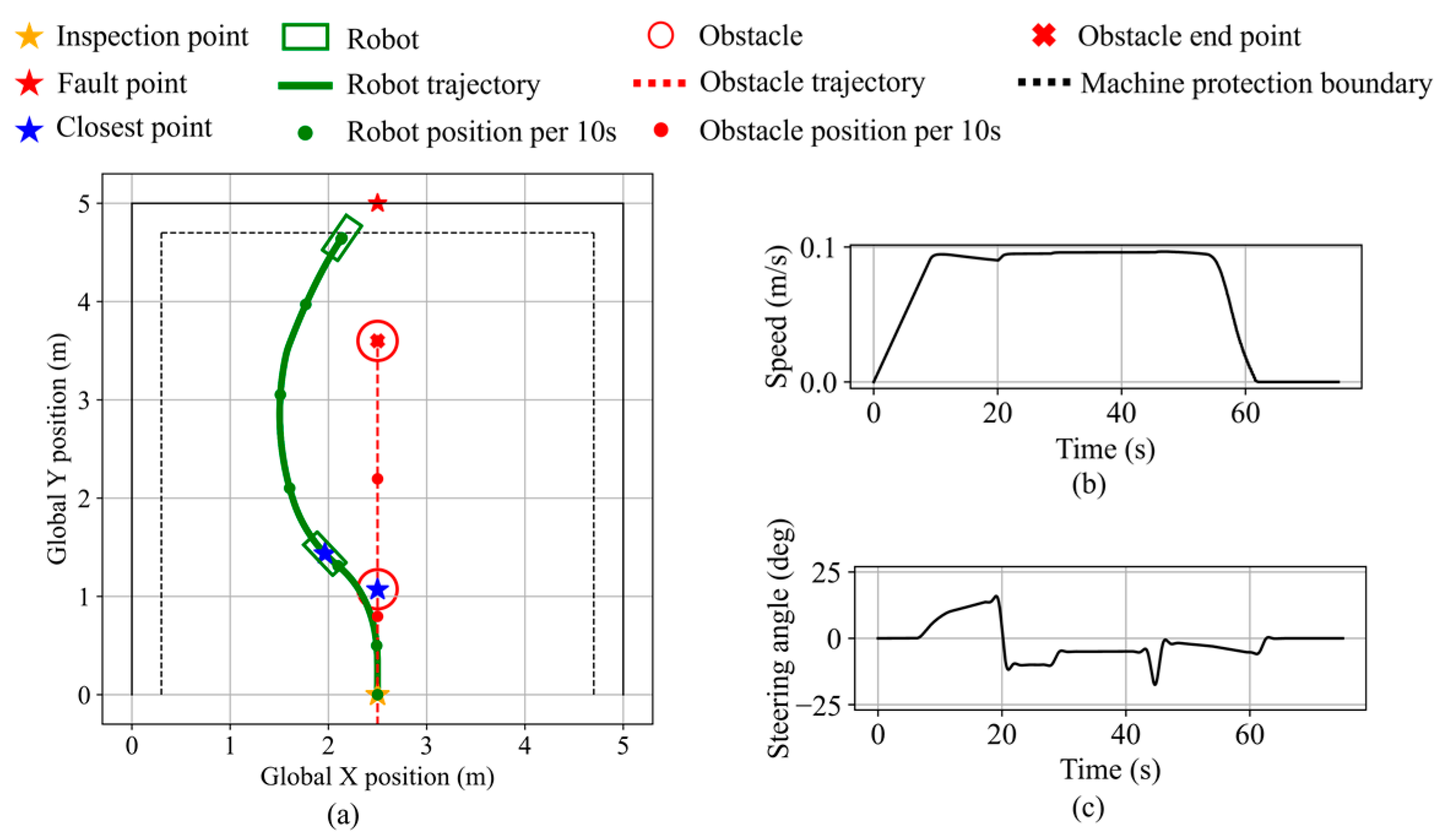 Robot states during dynamic obstacle avoidance in validation scenario 4. (a) Robot and dynamic obstacle trajectory. (b) Robot speed. (c) Robot steering angle.